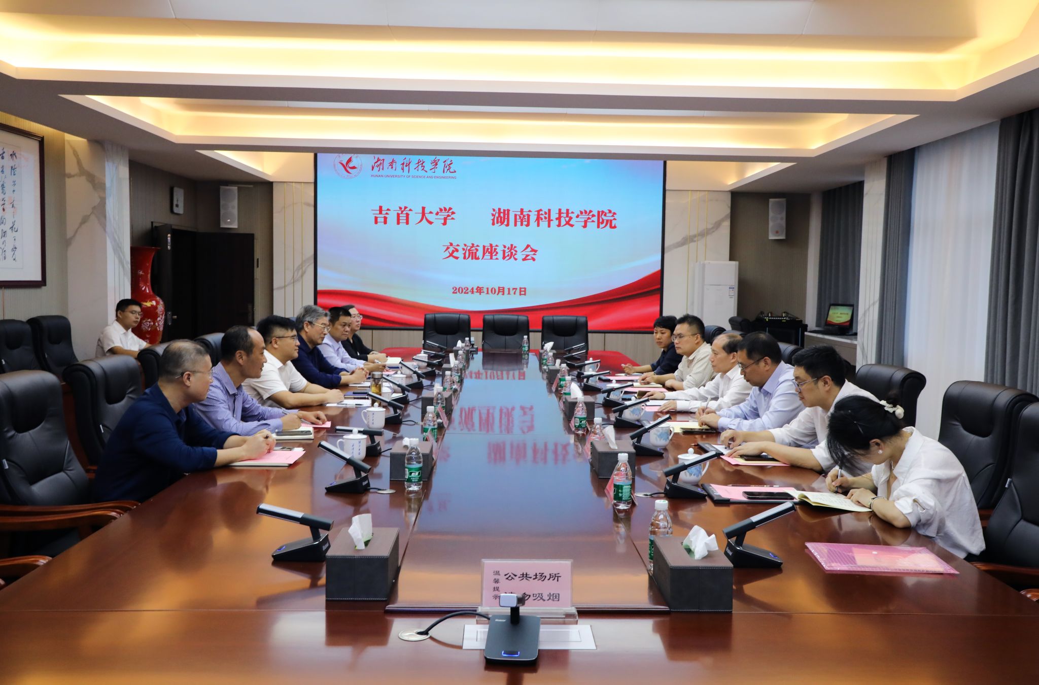 本网讯(记者 向薛峰 摄影 谢志豪)10月17日,吉首大学党委书记廖志坤一行来校考察交流。校党委书记李钢,党委副书记宋宏福,党委委员、组织部部长杨涛参加交流活动。