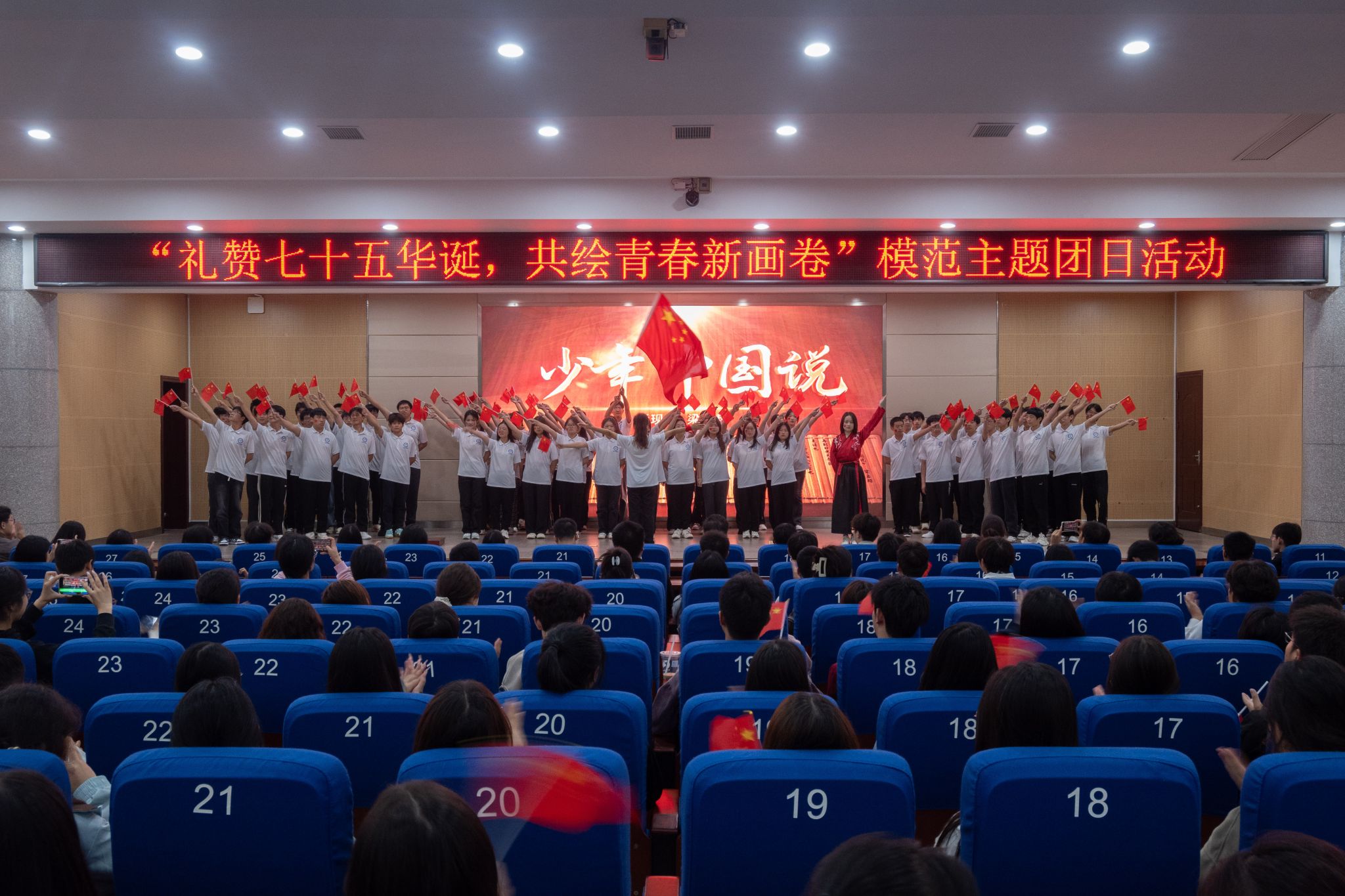 伴随着庄严的中国共产主义青年团团歌,本次活动拉开了序幕。合唱《不忘初心》《少年中国说》《我爱你中国》真挚热烈,激昂的旋律与深情的歌声交织,抒发爱国情怀,激励着新一代青年以奋发之姿,为实现中华民族伟大复兴的中国梦拼搏奋进。微团课《厚植国家情怀,谱写青春赞歌》带领同学们学习了新中国成立七十五周年来的辉煌成就和英雄模范事迹,牢记习近平总书记殷切嘱托,坚定爱国情,砥砺强国志,弘扬报国行。情景剧《山河已无恙,英雄归故里》刻画出中国人民志愿军入朝作战,经过艰苦卓绝的战斗最终赢得伟大胜利的生动场景,彷佛使人身临其境,震撼人心,抗美援朝精神跨越时空、历久弥新,现场气氛热烈,掌声雷动。