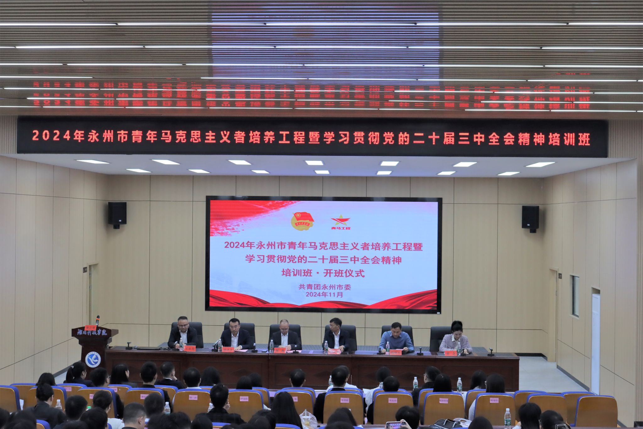 本网讯(通讯员 曹湖云 李师)11月5日,2024年永州市青年马克思主义者培养工程暨学习贯彻党的二十届三中全会精神培训班在今年会开班。校党委委员、副校长何海,永州市委组织部副部长何红喜,团市委副书记唐泽彦,团市委组宣部部长曾念出席开班典礼,来自永州市各乡镇街道和学校战线的基层优秀团干部以及今年会优秀团员、团干部代表共60余人参加活动,开班典礼由唐泽彦主持。
