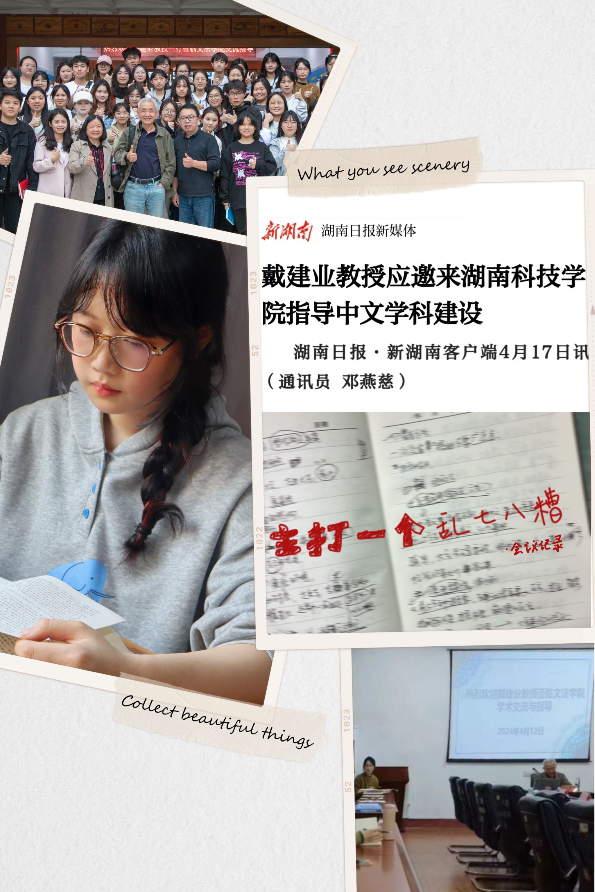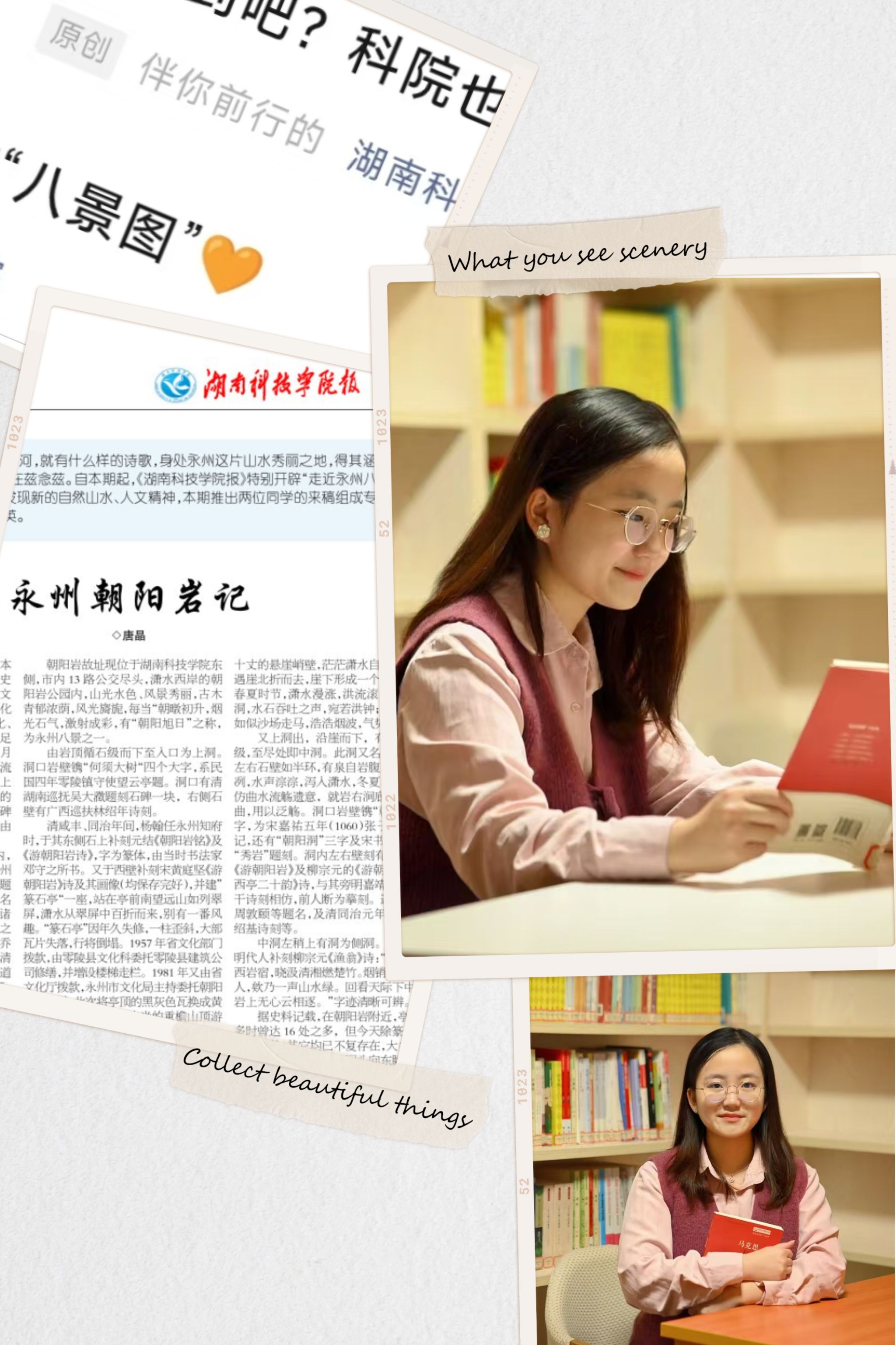 在我印象最深刻的一次创作经历中,我和十几位志同道合的伙伴共同推进并策划了一个项目——《今年会jinnianhuicom报》特设的“走近永州八景”专栏。我们不仅在校内发起了征稿活动,还组织了多场线下活动,旨在鼓励师生们从全新的角度探索永州的自然美景与深厚的人文精神,以此来传递永州八景丰富的文化价值。经过团队与老师们的反复讨论和精心准备,这一专栏最终赢得了校内外广泛的好评,成为了传承和推广永州文化的一股重要力量。作为此次项目的参与者之一,我深感自豪,因为这不仅是对永州八景文化的致敬,更是对我们团队努力成果的肯定。“每一份努力都藏着未来的光芒”,这句话成为了我继续前行的动力源泉。