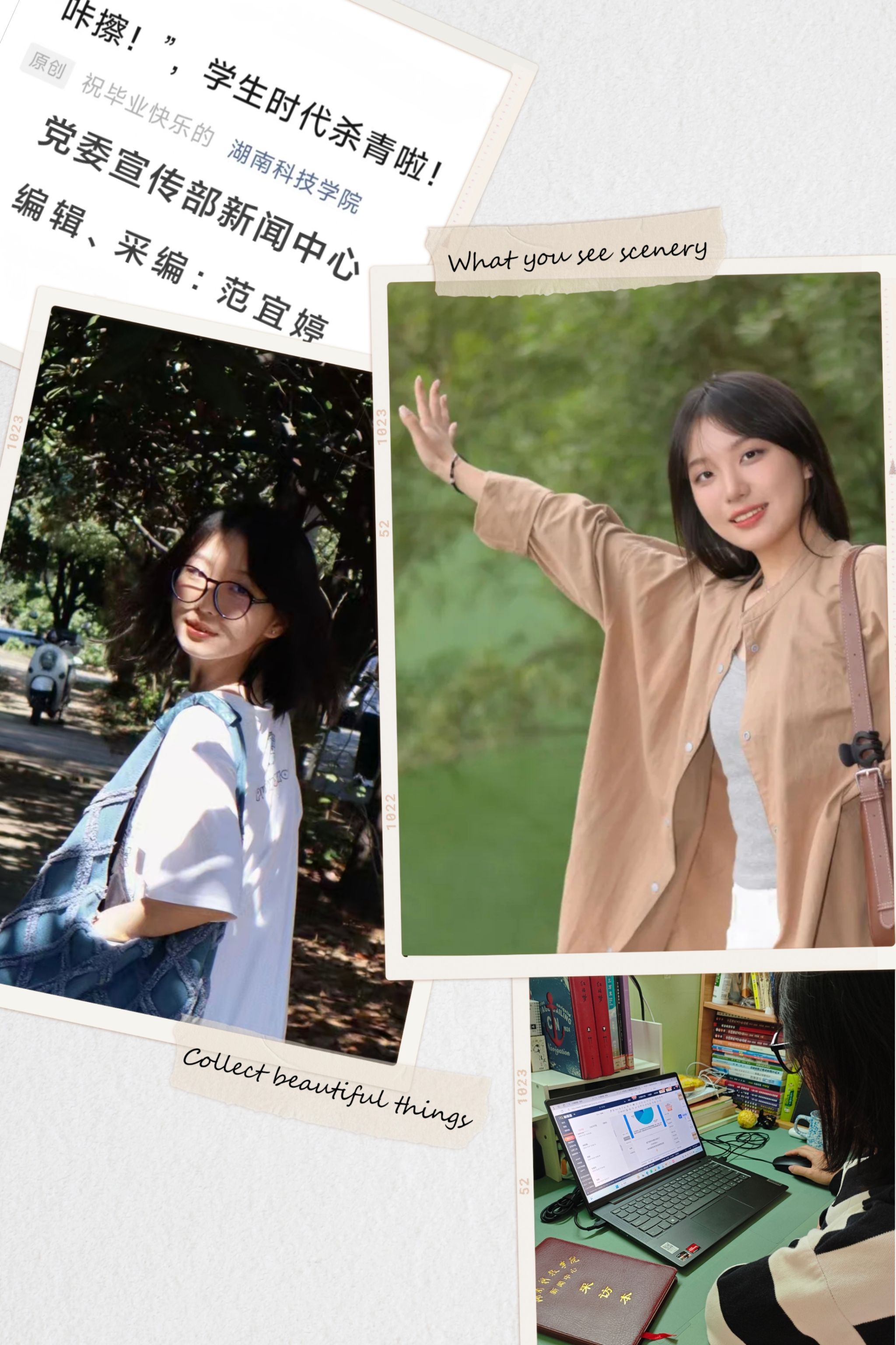 大一结束那年的暑假,我在官微编辑了一篇关于毕业生大学四年变化的推文《“咔嚓!”,学生时代杀青啦!》,这是我发表的第一篇推文。完成这篇推文的过程不仅是一次对自我能力的挑战,更是一段心灵成长的旅程。在采编过程中,面对被拒的恐惧,我学会了坚持与沟通的重要性,这让我深刻体会到,作为新闻工作者必备的不仅是勇气和冲劲,还有那份对工作的热爱与执着。当最后一张照片上传完毕,看到毕业生们从初入校园时的青涩不安到毕业时的自信微笑,这份转变如同一部无声的电影,在我眼前缓缓播放,激发了我对未来无限可能的向往。正如一位学姐所言:“人生是一场未知的征途,不到最后一刻就没有所谓的终点,而明天,我们又将踏上征程。”这句话不仅成为了推文中的亮点,也成为了我个人成长道路上的一盏明灯,照亮着我前进的方向。