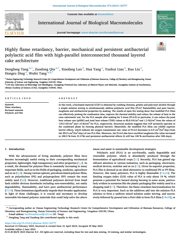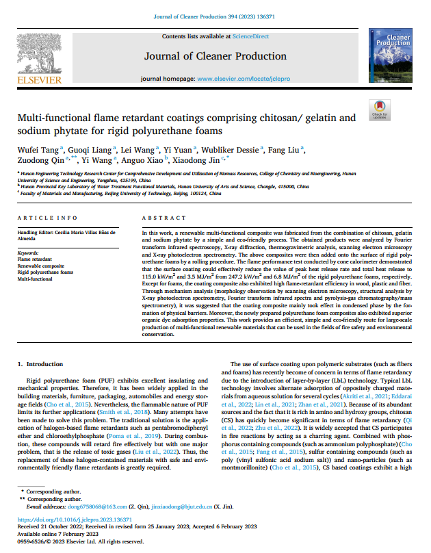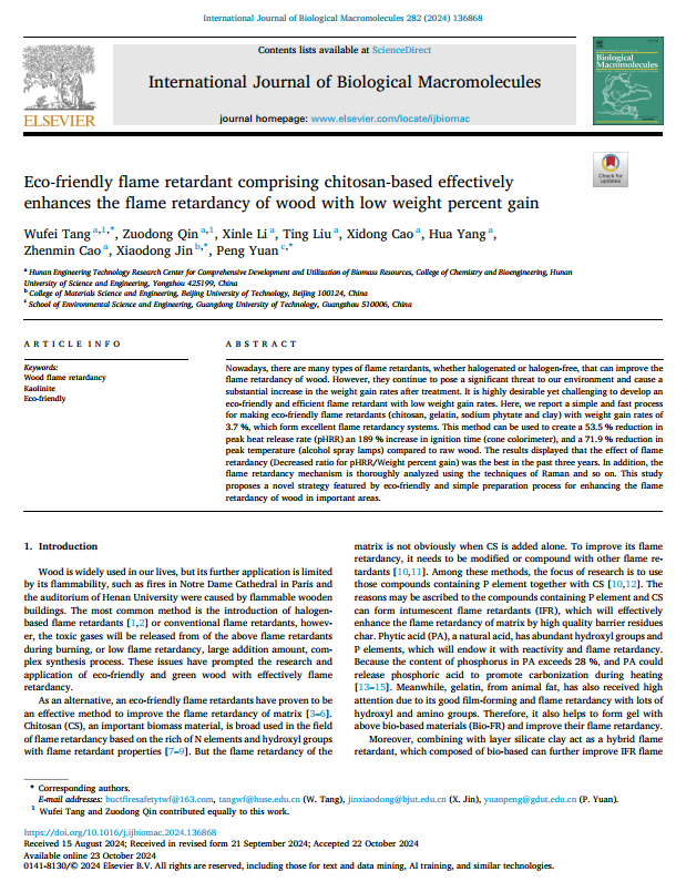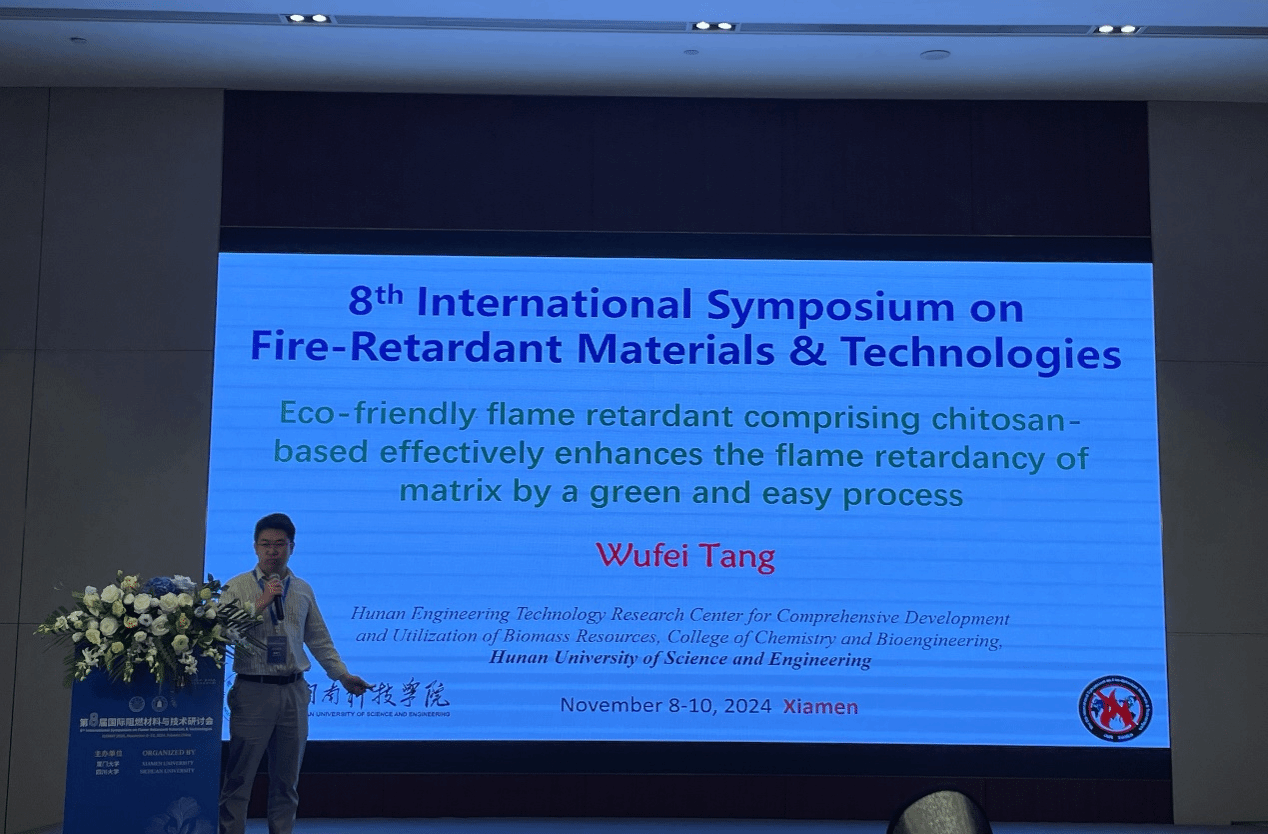 会上,唐武飞博士作了题为《Eco-friendly flame retardant comprising chitosan based effectively enhances the flame retardancy of matrix by a green and easy process》的学术报告,他介绍了如何巧妙利用生物基阻燃剂,通过简易、环保等工艺,高效获取多功能的阻燃复合材料,且多角度对比了近些年的相关文献,彰显出该工作的优势,并阐明该类阻燃剂在燃烧过程中的燃烧机理,为生物基阻燃剂在上述领域的工业化应用提供了科学参考。