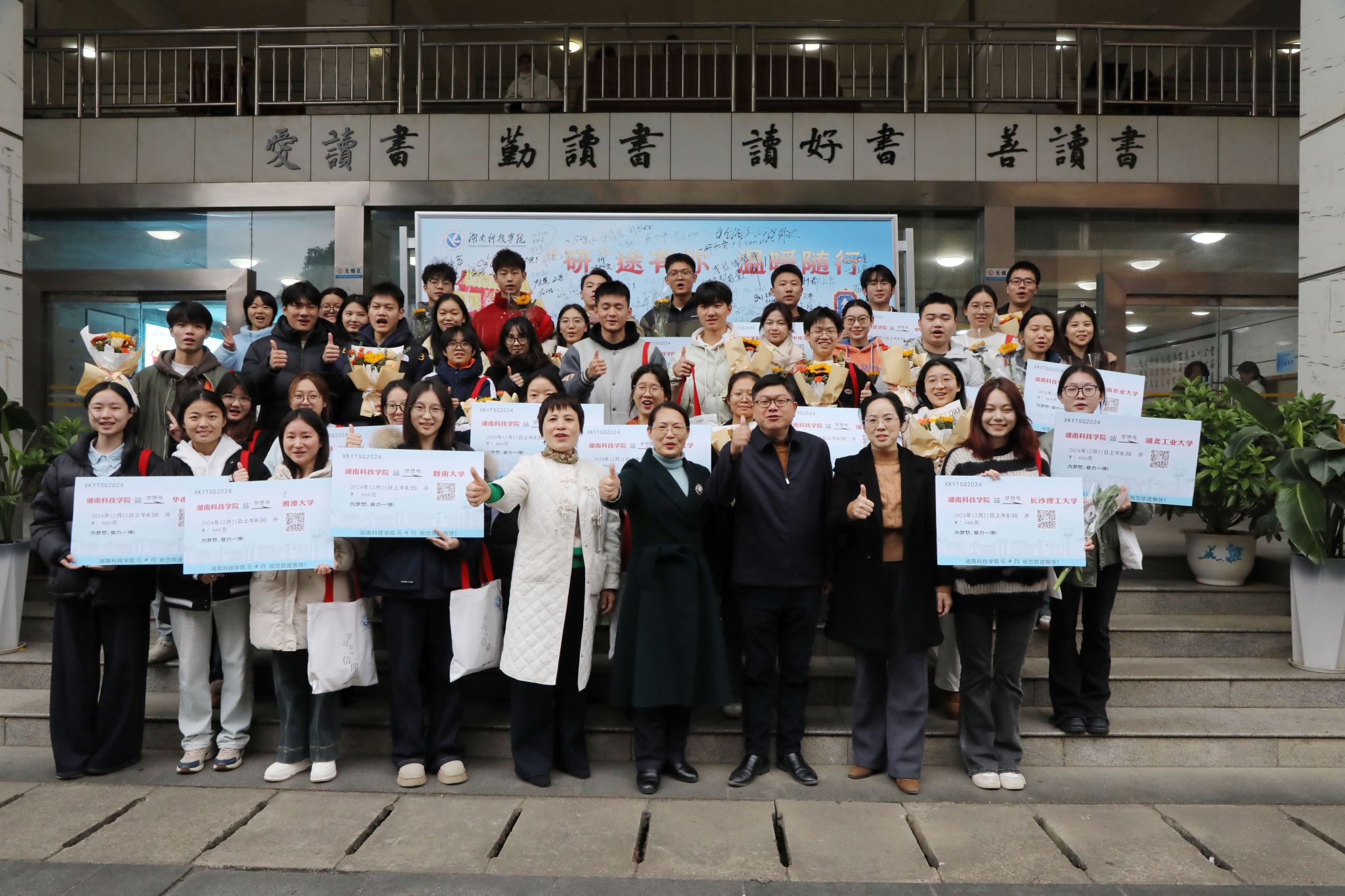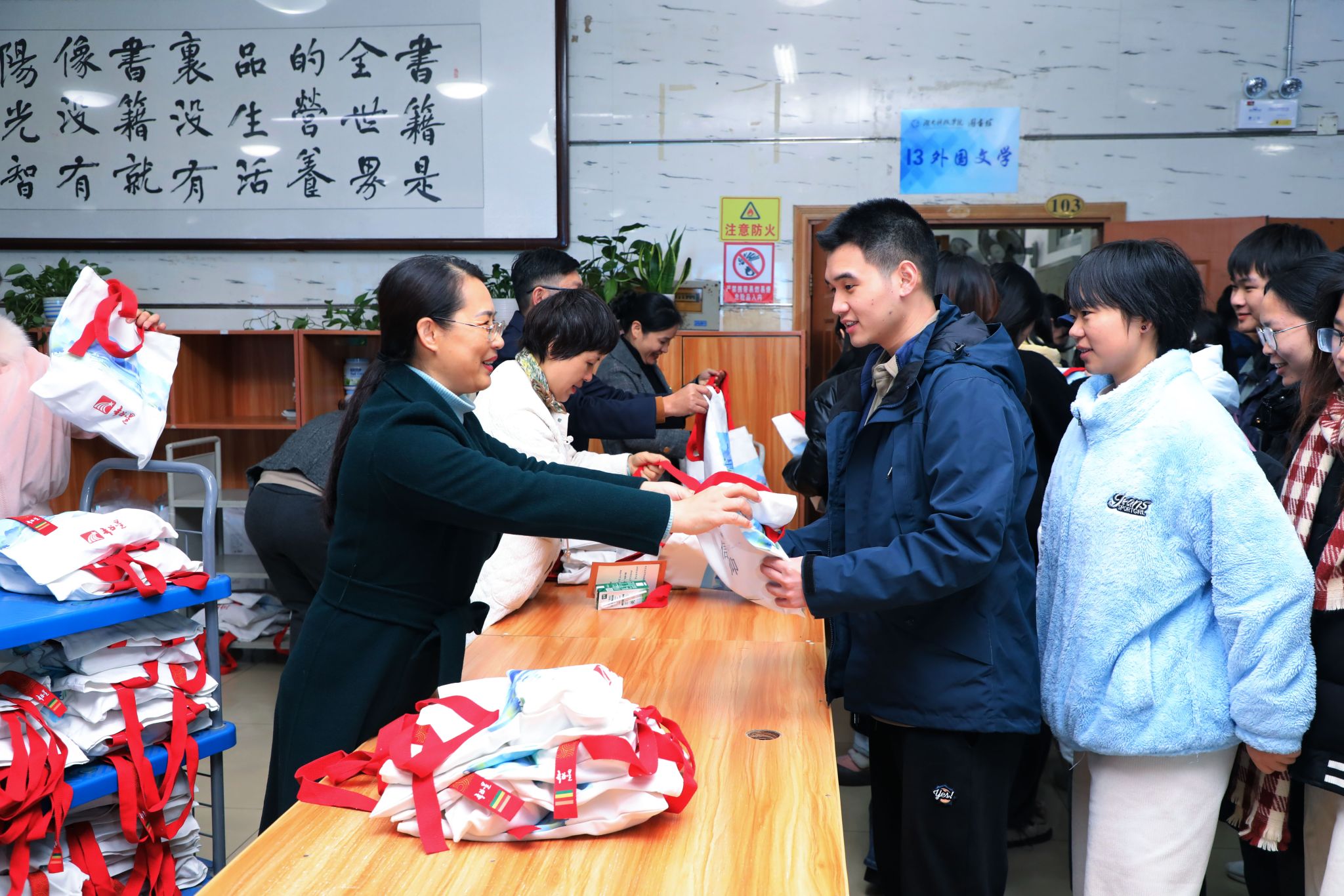 在12月5日的“考研加油站”活动现场,副校长郑银芳等学校领导为考研学子发放“加油”礼物。校长署名贺卡、金典牛奶、鲜橙、定制糕点等千余份专属福袋让同学们倍感温暖。还有众多供同学们挑选的励志明信片、书签和贴纸,“考得上、来得及、你可以”“前程似锦,未来可期”……一字一句,都写满了对同学们的殷切期望和美好祝福。馆长包本刚表示:“小小礼物代表了学校的祝福,寓意“金”榜题名、心想事“橙”和再攀新“糕”,寄托着图书馆对考研学子的殷殷关切和美好祝福,希望考研学子们都能如愿以偿,顺利上岸!”