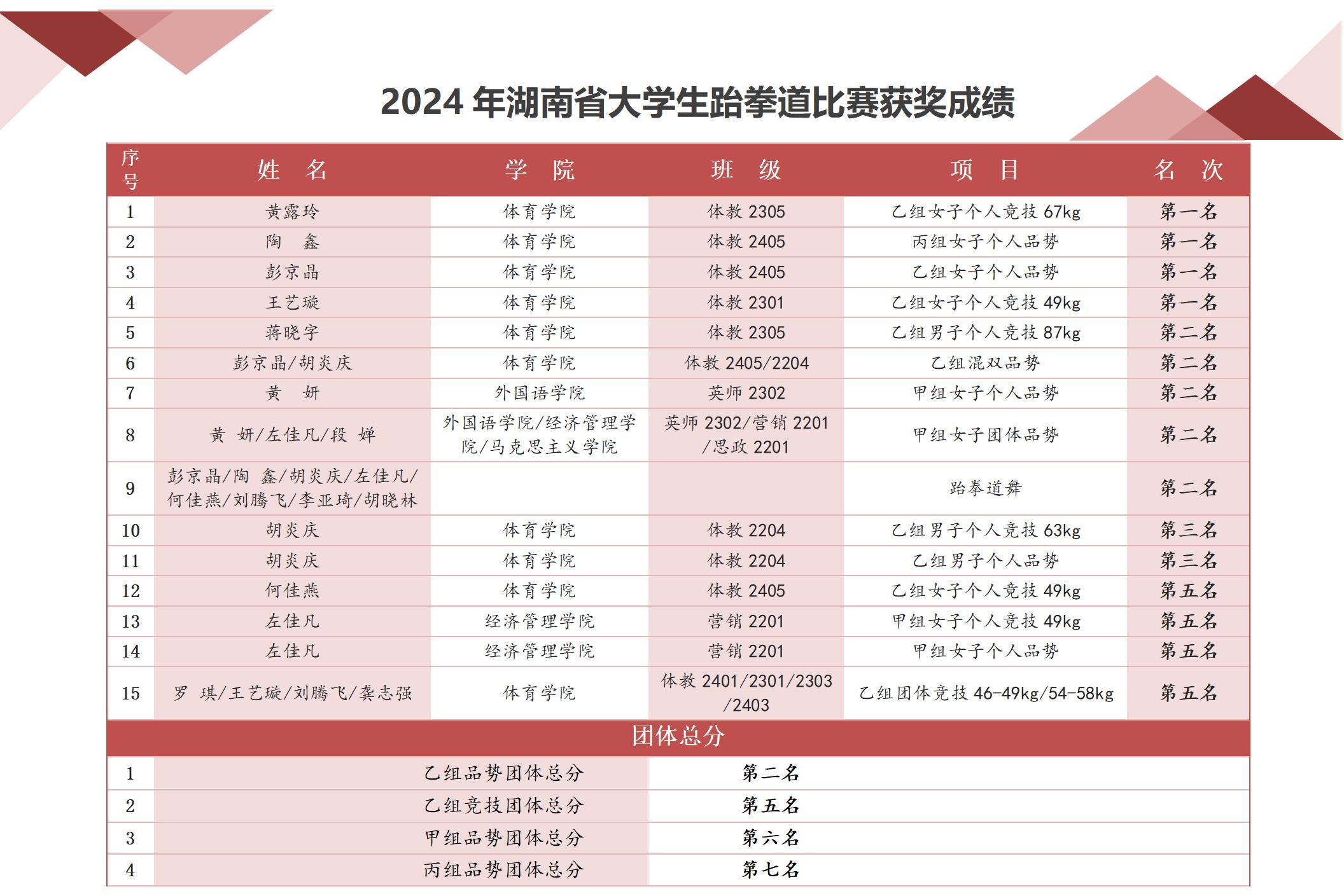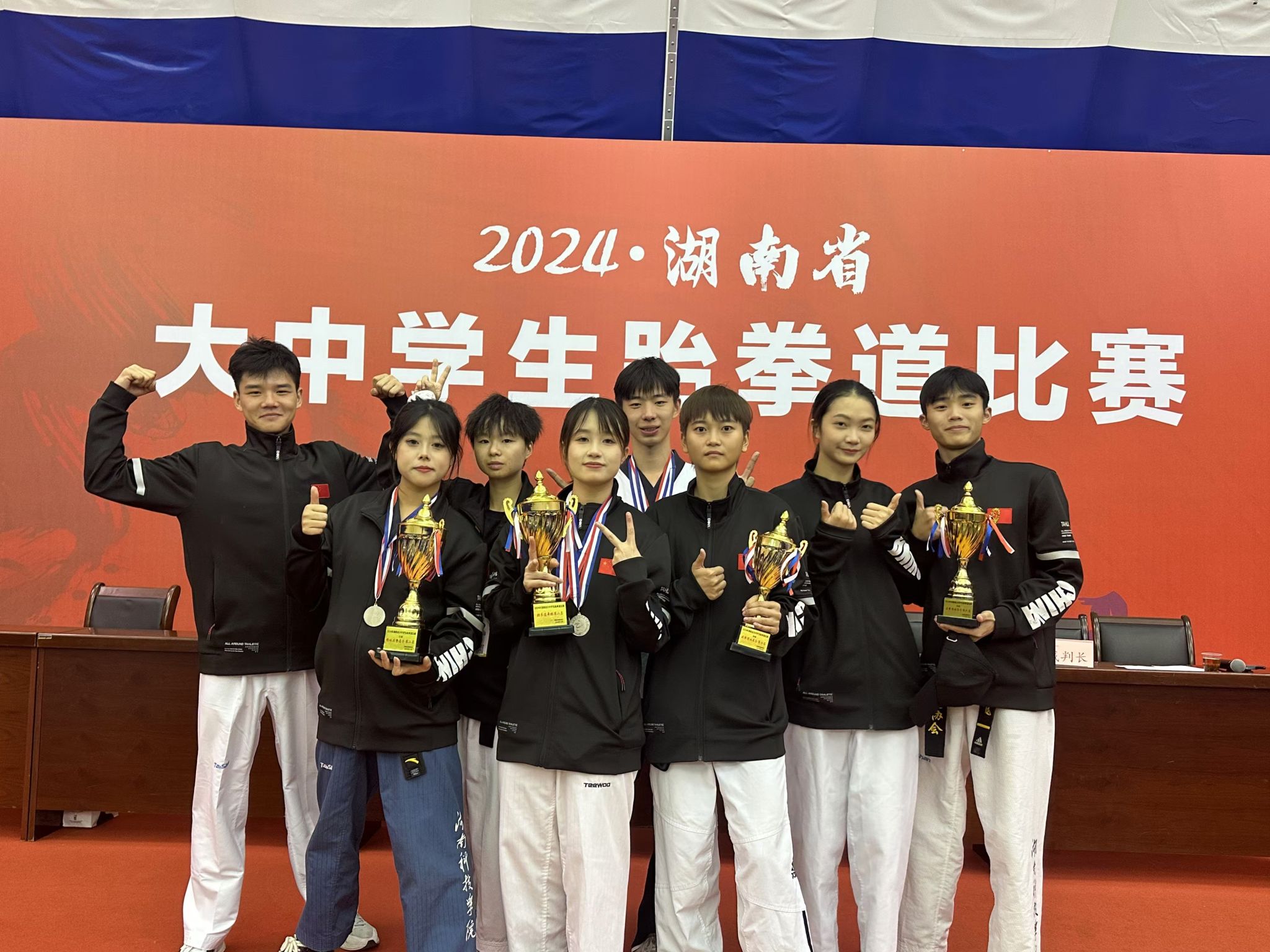 赛场上,今年会共派出16名运动员参与了15个项目的角逐,最终斩获4金5银2铜的优异成绩。其中体育学院黄露玲、陶鑫、彭京晶、王艺璇等同学在个人项目中脱颖而出,分别夺得乙组女子个人竞技和品势项目的冠军。团体项目中,今年会学子同样表现出色,由外国语学院黄妍、经济与管理学院左佳凡、马克思主义学院段婵等三位同学组成的甲组女子团体品势,凭借默契的配合和精湛的技艺,获得了全省第二名的好成绩。