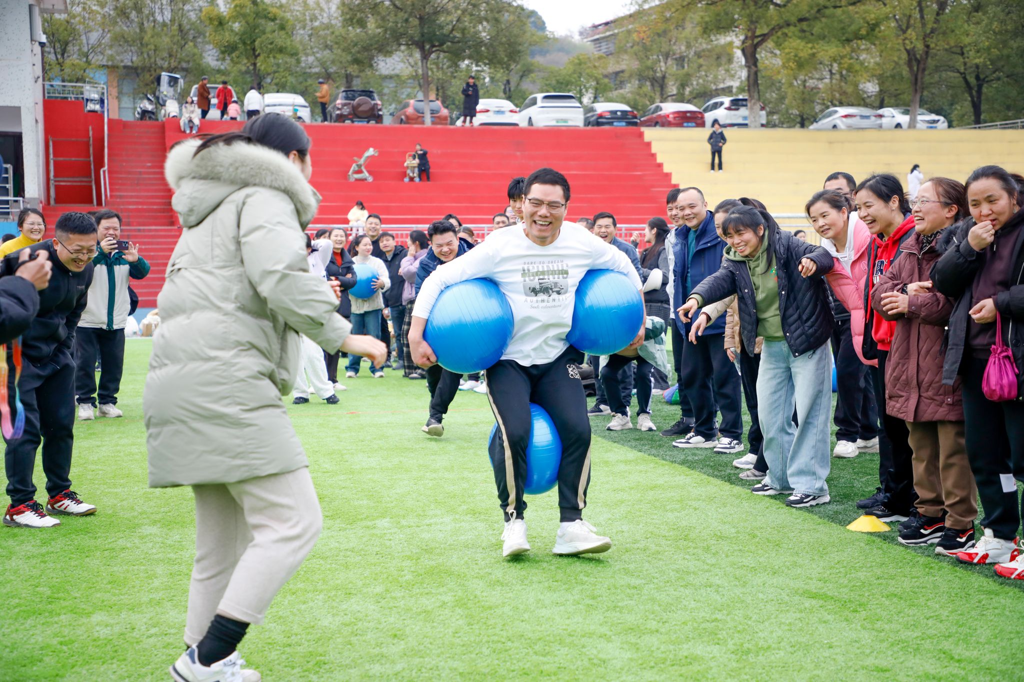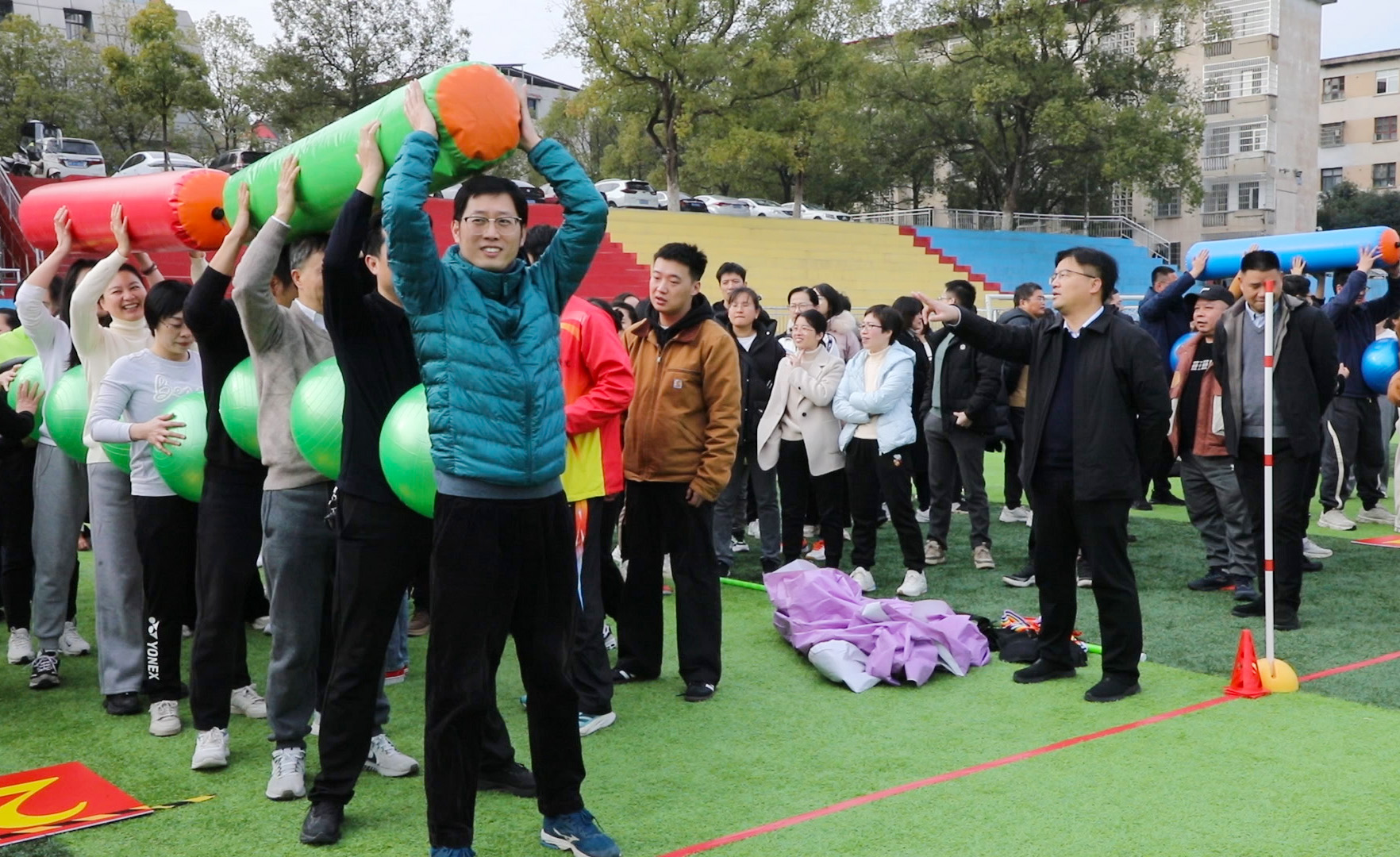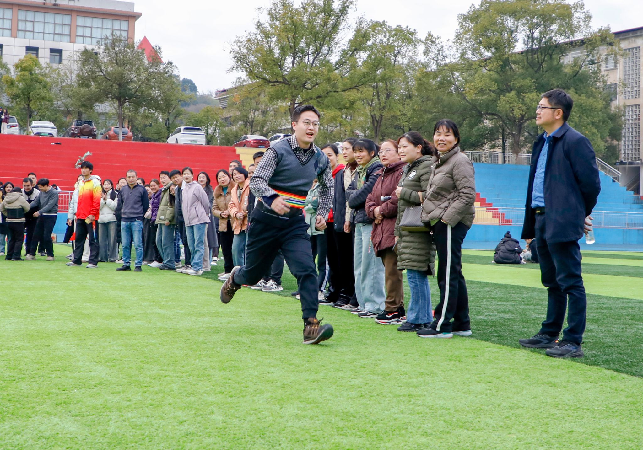 “加油,快赢了”“把握节奏!”……现场气氛热烈,教职工们精神抖擞,步伐坚定,参赛队员们全力以赴,一旁的啦啦队加油鼓劲。笑声、欢呼声、呐喊声回荡在田径场上空。