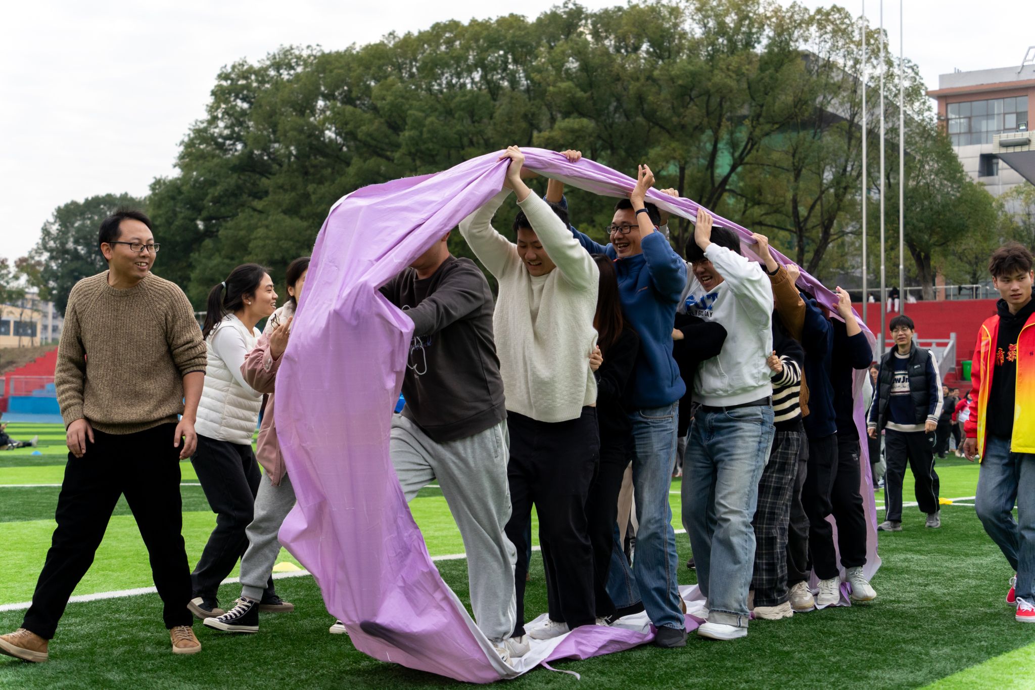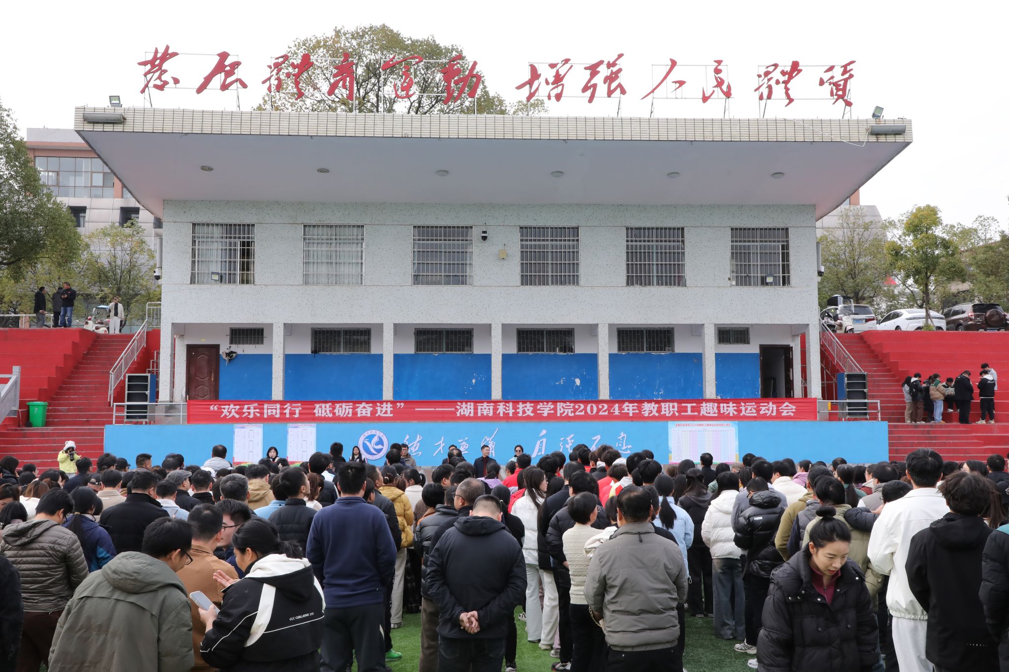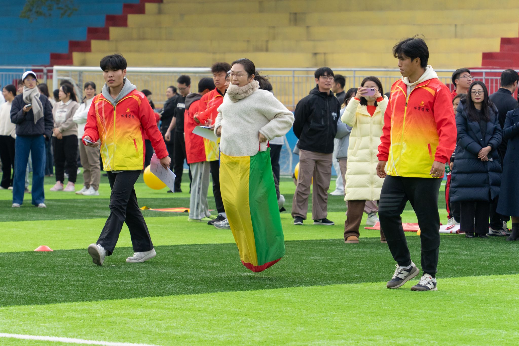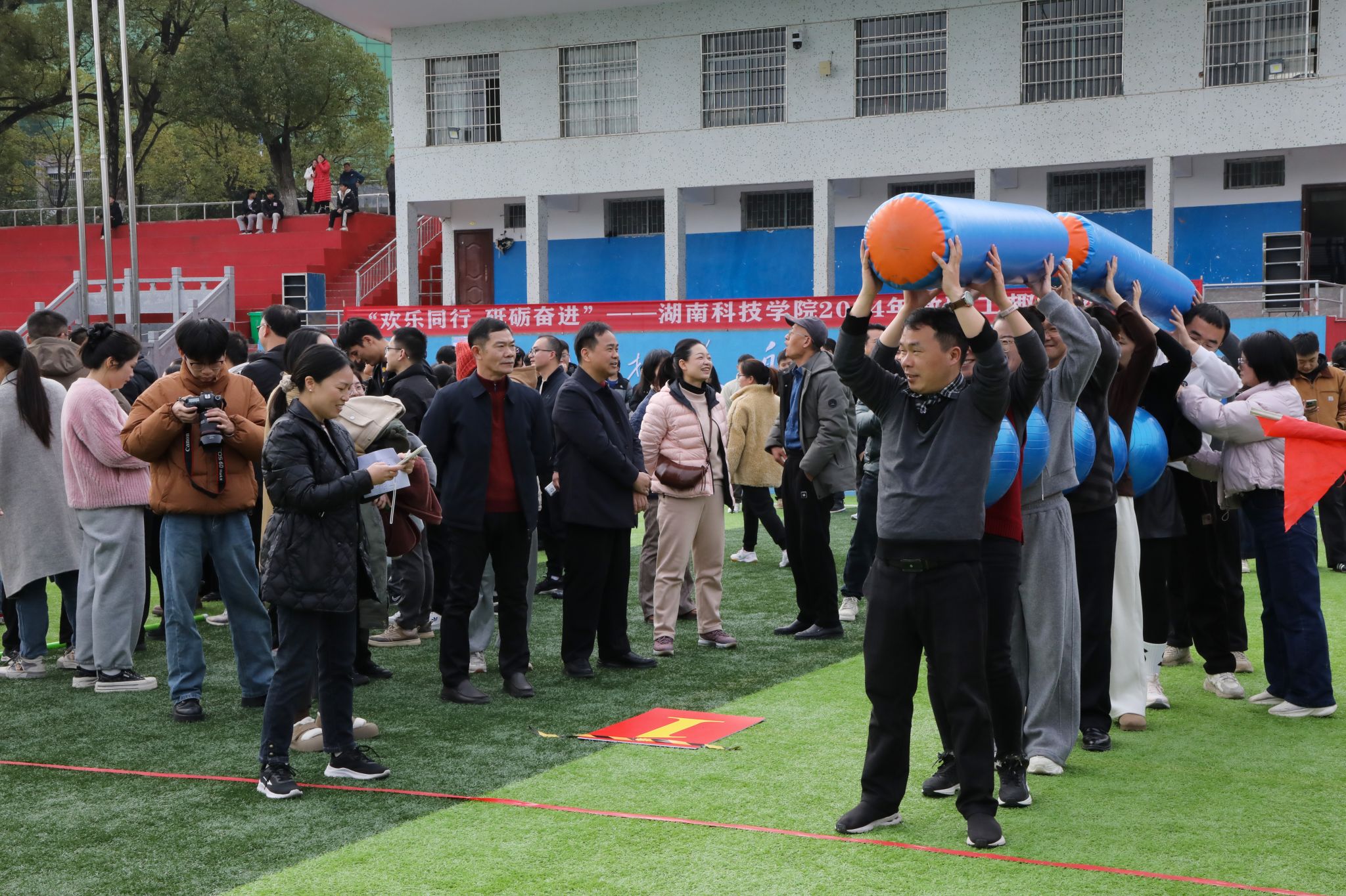 “加油,快赢了”“把握节奏!”……现场气氛热烈,教职工们精神抖擞,步伐坚定,参赛队员们全力以赴,一旁的啦啦队加油鼓劲。笑声、欢呼声、呐喊声回荡在田径场上空。