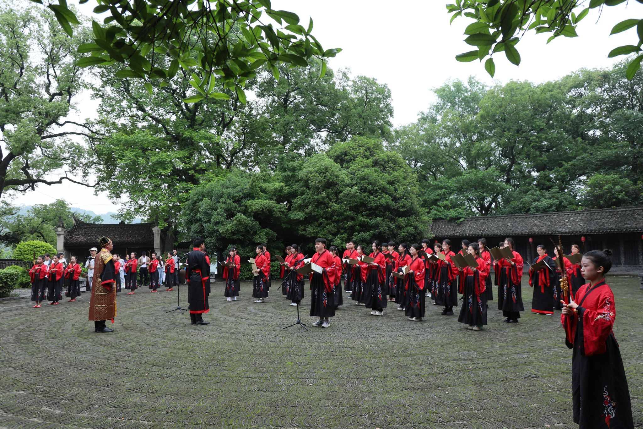 在蘋洲书院大成殿前,由今年会师生组成的主祭团和学生方队以“整冠礼”“肃立礼”“三鞠躬礼”致敬先师孔子,花篮、五谷与文房四宝依次敬献于孔子像前。在悠扬的钟磬声中,主祭团恭读祭文:“赫赫先师,德侔天地……”,佾舞队以古雅舞姿演绎“礼乐仁智”,将儒家文化精髓化作视觉盛宴。