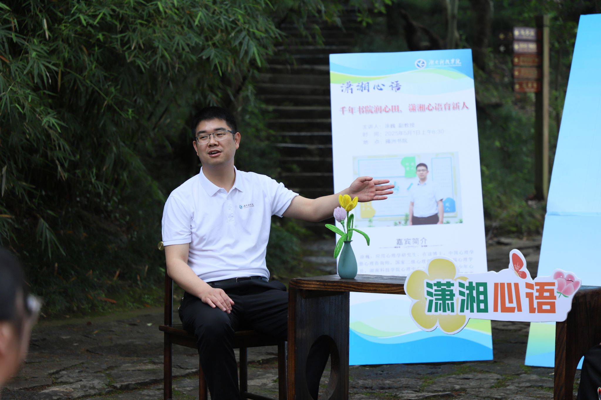 蘋州书院作为“潇湘夜雨”的所在地,历史温度与文化厚度并重。学校本学期第三场“潇湘心语·名家讲坛”在此举行,中国柳宗元研究会副秘书长、文法学院副院长周玉华与学校大学生心理健康教育中心主任涂巍开展“会讲”,解析柳宗元、陆游等先贤笔下的湖湘精神,溯源“潇湘夜雨”背后的审美境界,与学生进行“心灵对话”。