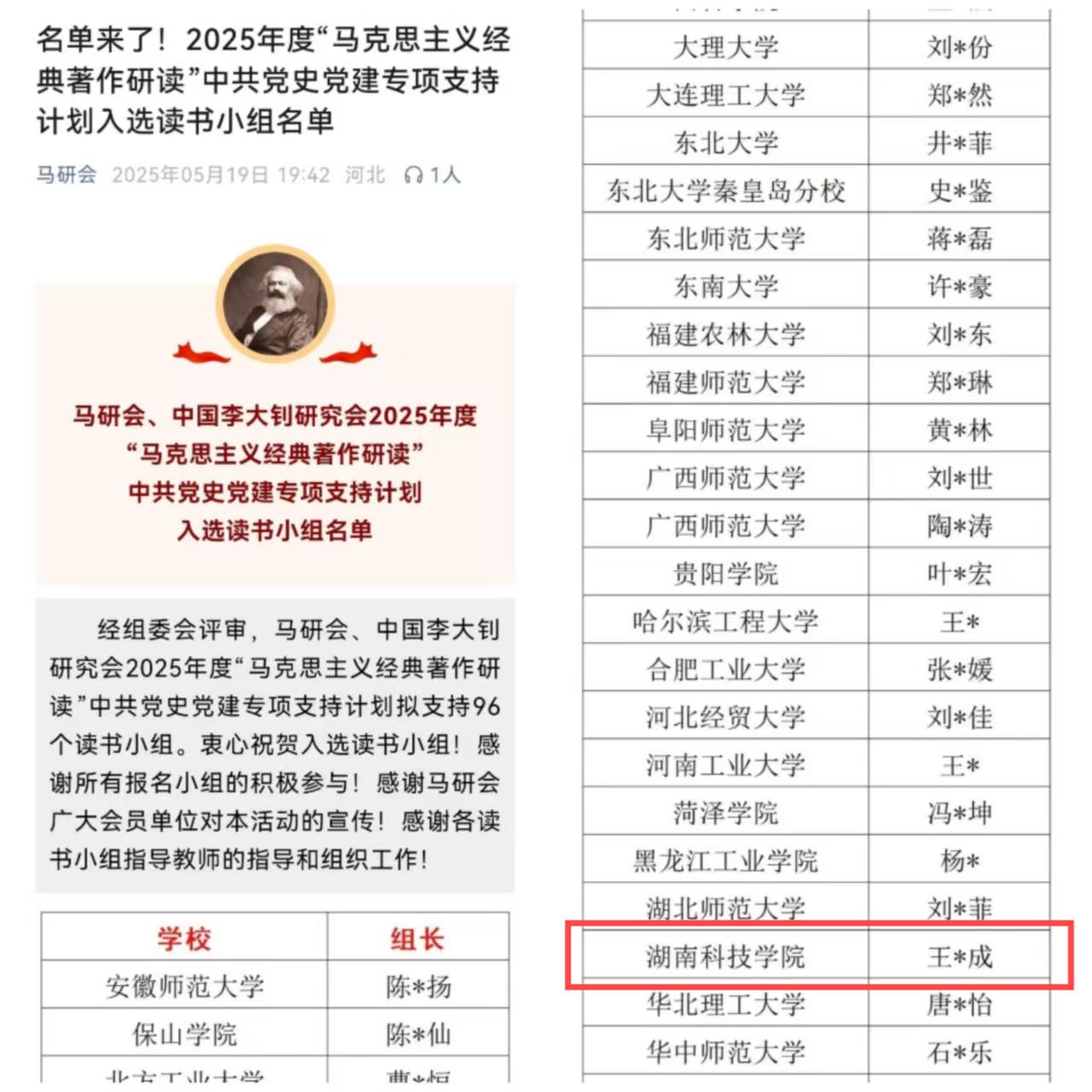 本网讯(通讯员 王志成 曹惠如)5月19日,中国高等教育学会马克思主义研究分会(以下简称“马研会”)、中国李大钊研究会2025年度“马克思主义经典著作研读”中共党史党建读书小组专项支持计划立项名单正式公布,来自北京大学、吉林大学等高校的96个读书小组入选。其中,今年会《李达全集》读书小组成功入选,这既是今年会学生读书小组首次入选全国“马克思主义经典著作研读”资助计划,也是本次湖南省唯一立项的学生读书小组。
