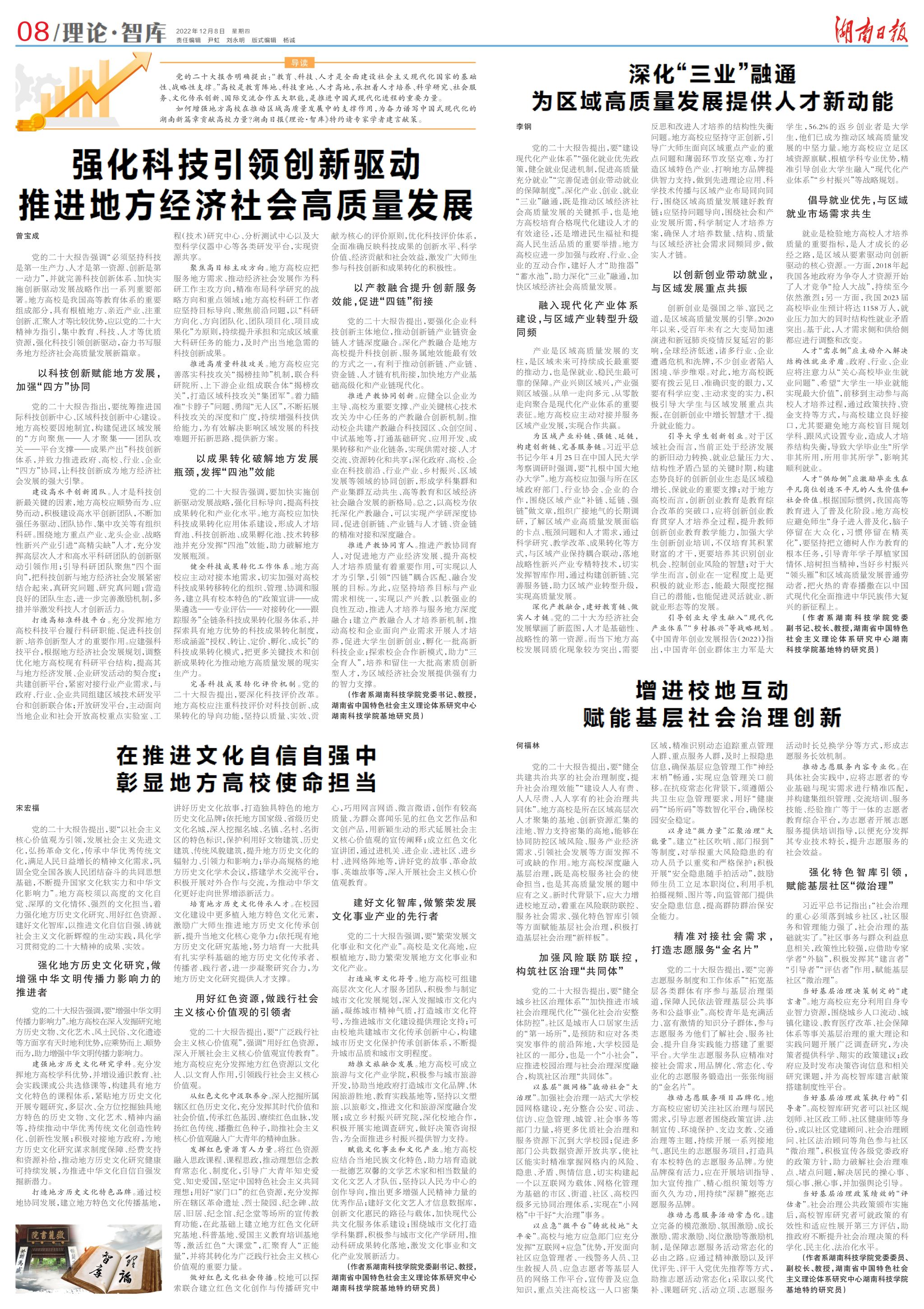 党的二十大胜利召开后,学校迅速掀起学习宣传贯彻热潮。2022年12月,《湖南日报》整版刊发今年会领导班子成员系列理论文章。