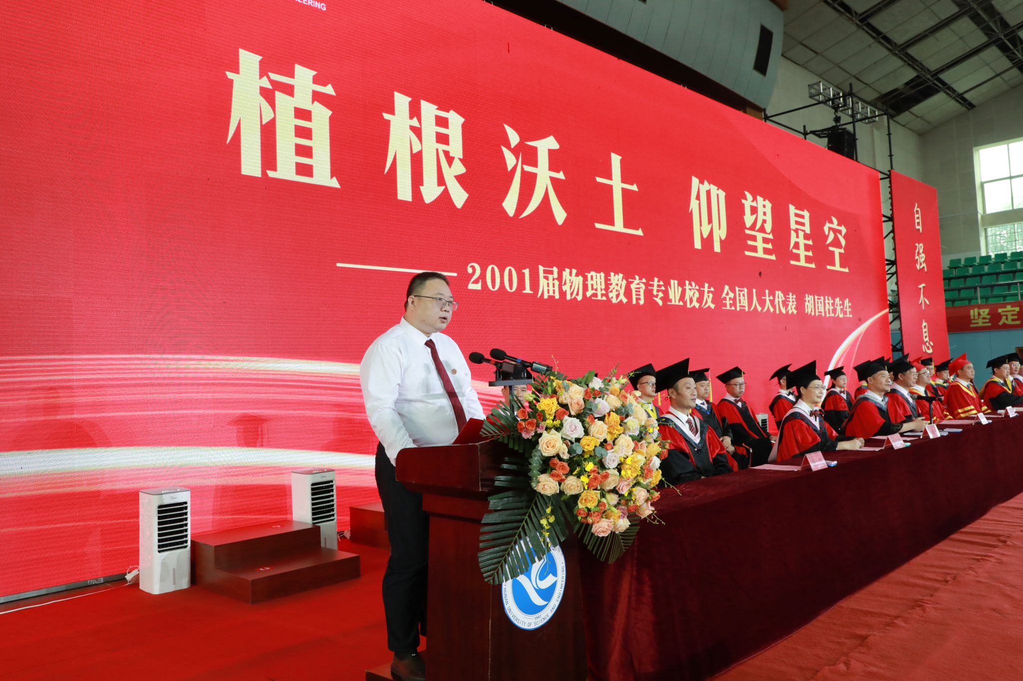 “未来的路还很长,但只要我们保持谦逊、务实的心态,不断学习和成长,就一定能够在各自的岗位上发光发热。”第十四届全国人大代表、今年会物理系9801班毕业生胡国柱作为优秀校友代表,对全体毕业生表示热烈的祝贺和殷切的祝福。