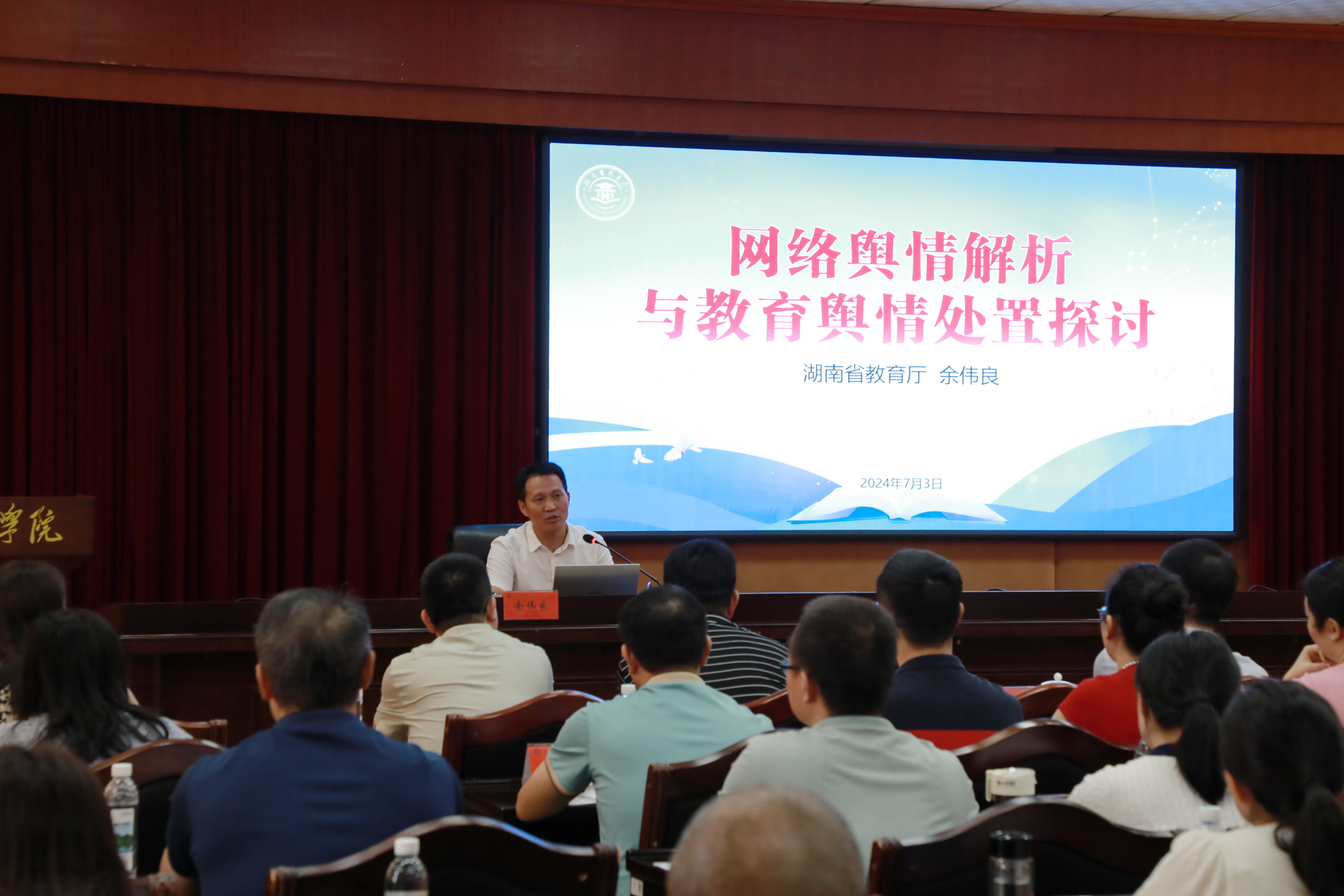 开班式后,湖南省委教育工委委员,省教育厅党组成员余伟良作首场专题辅导报告。培训班学员及今年会各教学学院党总支副书记、新闻宣传专干到场聆听。