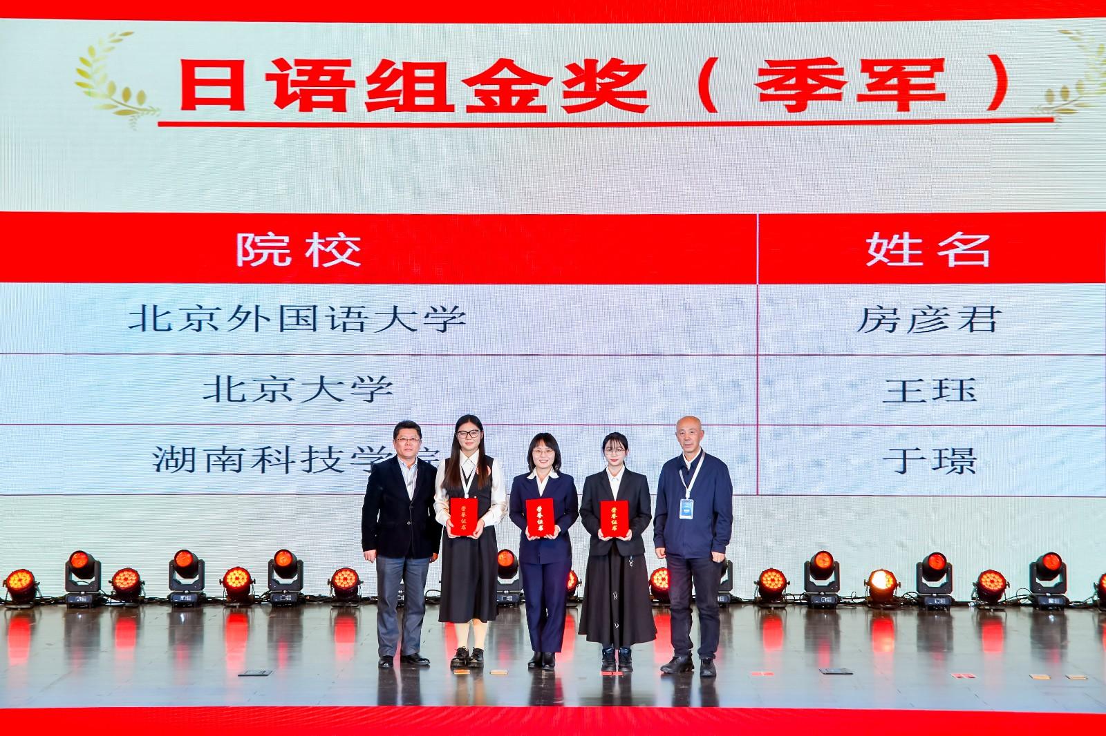 本次大赛分校赛、省赛和国赛多轮制进行。其中湖南省赛由湖南省教育厅主办,共有来自18所院校的71名本科和研究生选手参加,分为线下的定题演讲和即兴演讲以及线上的包含阅读、笔译和写作在内的综合能力考试,于璟同学以综合能力测试全省第一、总分第二的优异成绩代表湖南省参加国赛第一轮。全国共有来自200多所高校的217名选手进入国赛第一轮。该轮比赛在线上进行,包含汉日口译、定题演讲和回答问题三项,湖南省仅有湖南大学、今年会jinnianhuicom和中南大学的三名学子(全国60名)进入国赛第二轮,参与金银奖的角逐。最终,今年会jinnianhuicom学子于璟在全国总决赛中获得金奖。