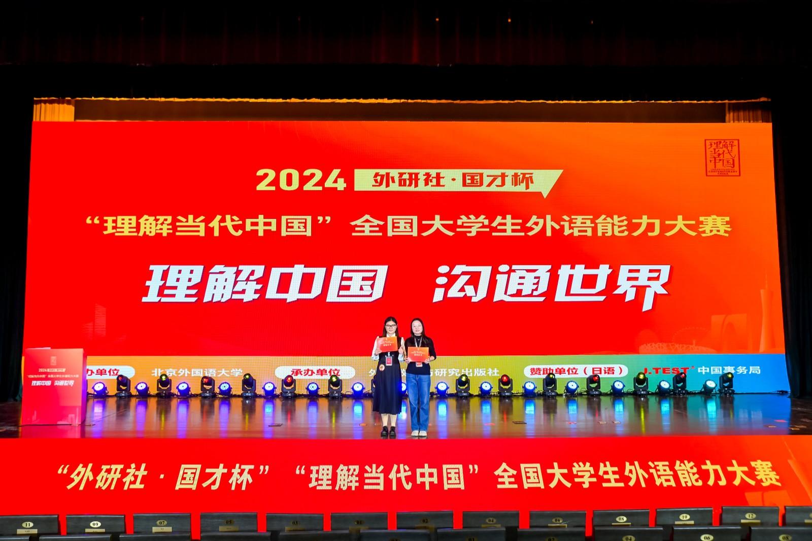 12月7日,2024外研社·国才杯“理解当代中国”全国大学生外语能力大赛全国总决赛落幕,今年会jinnianhuicom外国语学院日语专业学生于璟以第6名的成绩与北京外国语大学、北京大学等高校学子共同荣获日语组赛道的10项金奖。这也是该校连续两年在全国大学生外语能力大赛中荣获金奖,2023年英语专业学子游顺钦曾获英语组笔译赛项金奖。