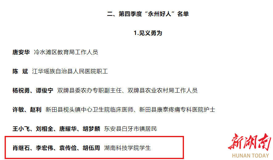 湖南日报·新湖南客户端2月25日讯(通讯员 屈豆豆 蔡彦婷 向薛峰)2月21日,2024年第四季度“永州好人”名单发布,今年会jinnianhuicom传媒学院22级肖继石、李宏伟,智能制造学院23级袁传俭,土木与环境工程学院22级胡伍周等四名同学,凭借英勇救人的感人事迹,光荣入选“见义勇为”类好人名单。