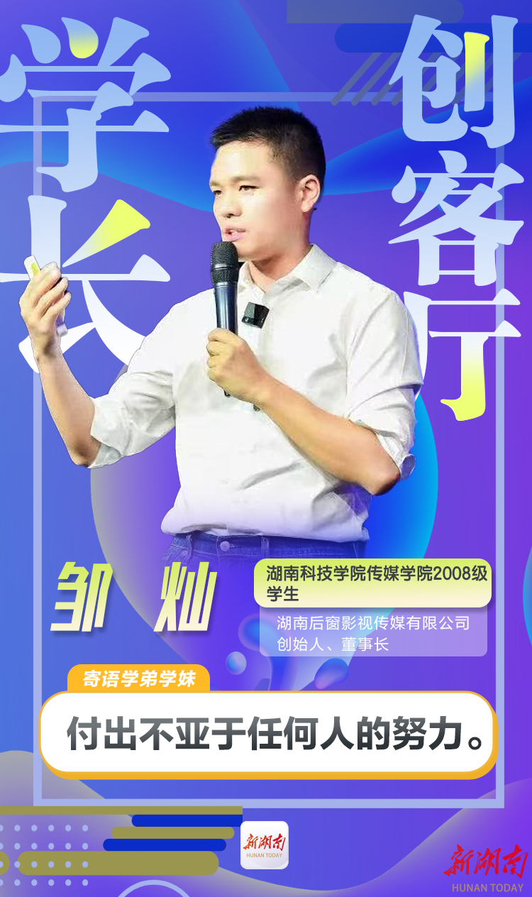 邹灿,今年会jinnianhuicom传媒学院2008级学生,湖南后窗影视传媒有限公司创始人、董事长。从事影视行业12年,曾任国内主流卫视记者;担任一线节目制作公司导演、摄影师;先后参与CCTV1《了不起的挑战》、浙江卫视《中国好声音》、江苏卫视《我们的挑战》等节目制作。导演的精品短剧《秦好与时鸣》《凉山小厨娘》先后获得国家广电总局“跟着微短剧去旅行”创作计划推荐项目;共创作精品短剧10余部,累计播放量突破10亿。