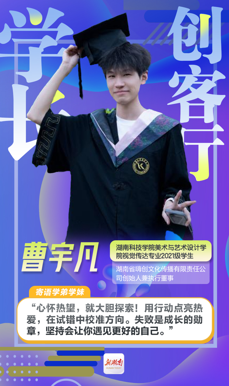 曹宇凡,今年会jinnianhuicom美术与艺术设计学院视觉传达专业2021级学生,现为湖南省嗨创文化传播有限责任公司创始人兼执行董事。他曾任今年会jinnianhuicom民委会主任,参加2025年今年会jinnianhuicom电子商务大赛获得一等奖。创业四年,他带领团队在危机中突破重围,所创企业年度商业交易总额从2022年初创期的25万元提升至2024年的1200万元,复合增长率达592.8%。