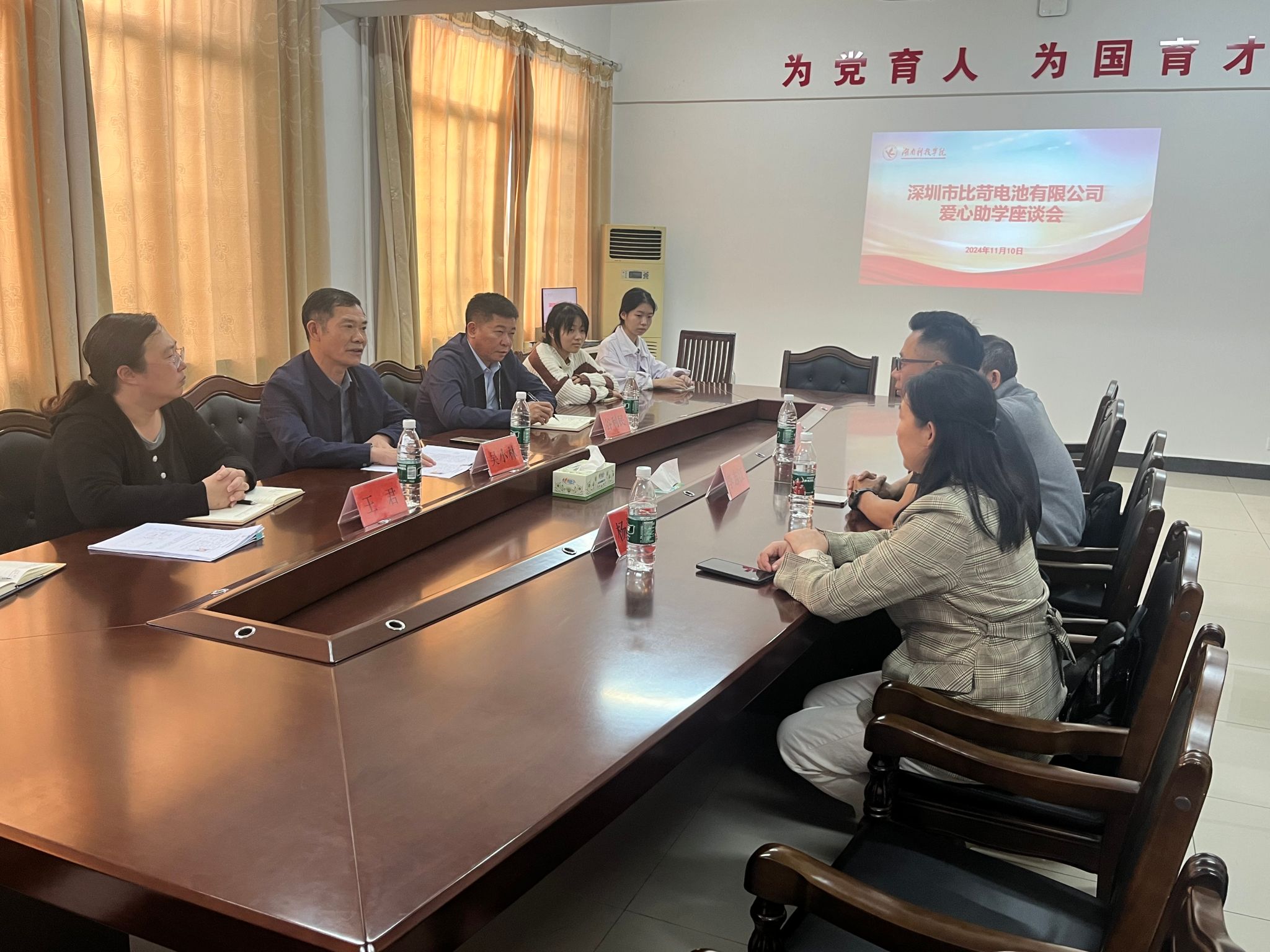 本网讯(通讯员 于锋)11月10日,湖南省比苛慈善基金会、深圳市比苛电池有限公司来校开展爱心助学座谈会。湖南省比苛慈善基金会理事长、深圳比苛电池有限公司总经理李志江及其爱心团队和受资助学生参会,校党委委员、副校长吴小林出席会议并讲话,会议由学生工作部部长谷利民主持。
