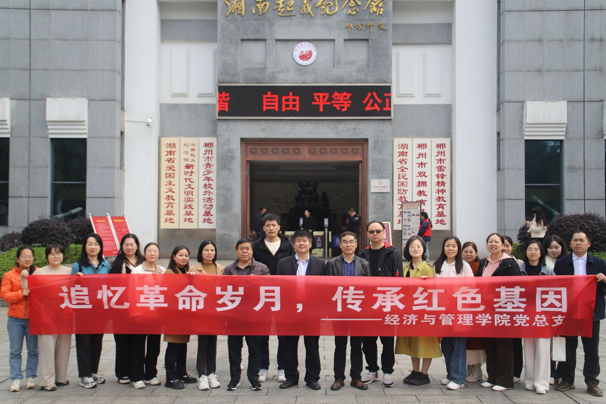 本网讯(通讯员 肖炜)11月24日,为深入学习贯彻党的二十届三中全会精神。经济与管理学院党总支组织全体党员同志赴郴州湘南起义纪念馆展开“追忆革命岁月,传承红色基因”主题党日活动,追寻革命先辈的光辉足迹,从历久弥新的革命情怀中感悟湘南革命的丰富内涵和时代价值。