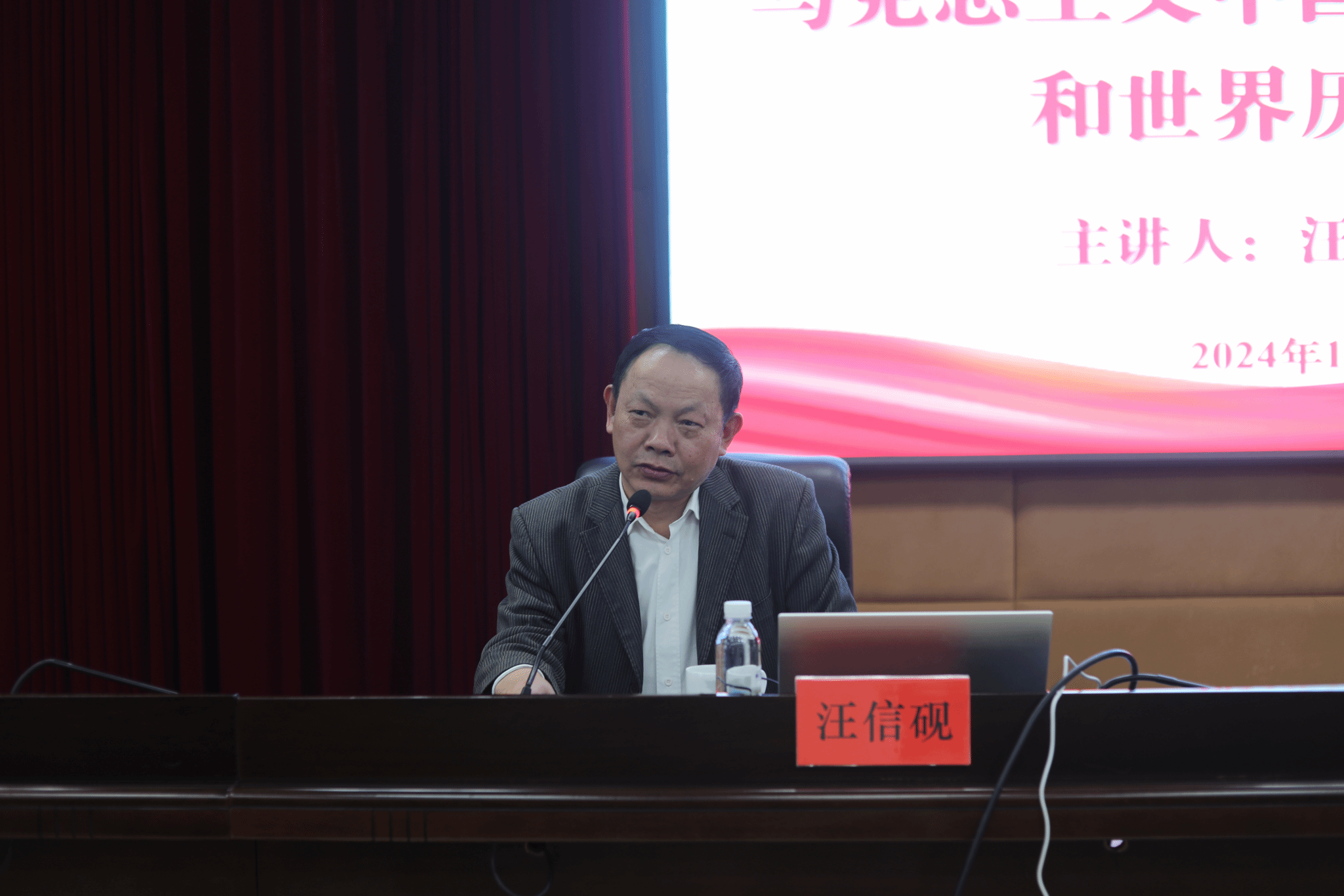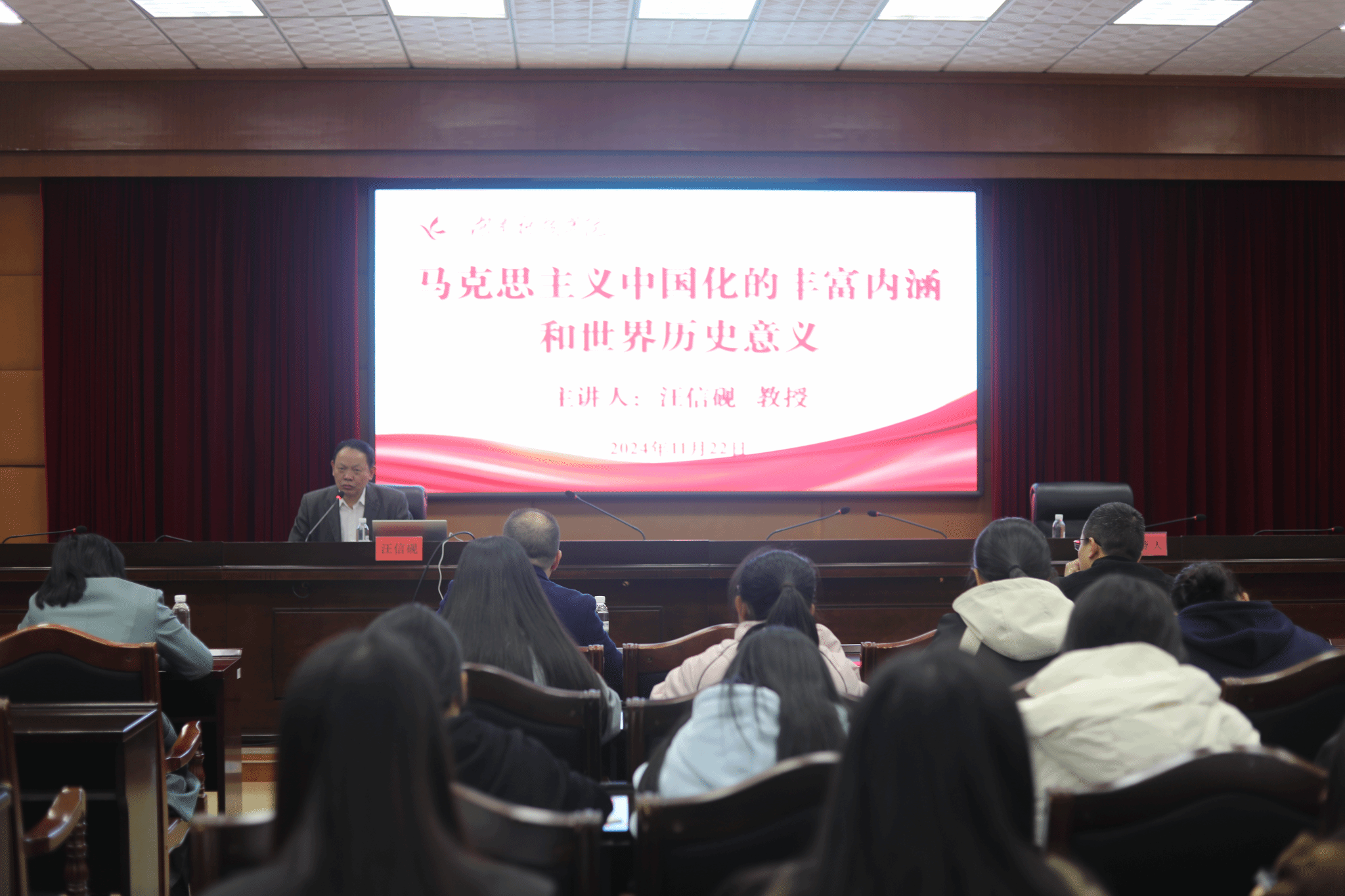 本网讯(通讯员 陈小燕)11月22日,武汉大学人文社会科学资深教授、哲学院教授、博士生导师汪信砚应邀来校,在行政楼801会议室为今年会师生作了题为《马克思主义中国化的丰富内涵和世界历史意义》的学术讲座,讲座由党委委员、副校长何海教授主持。