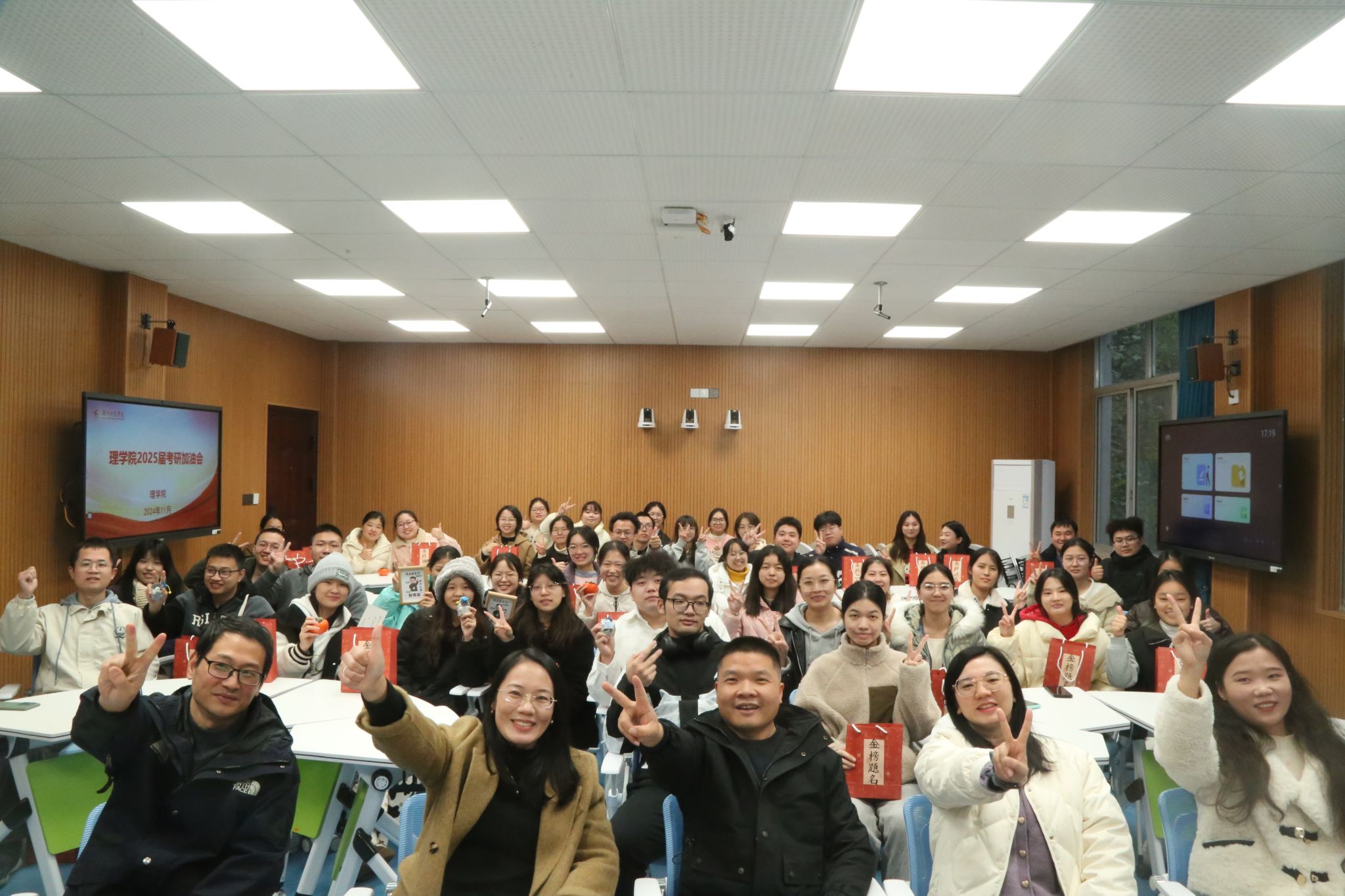 刘华鼓励同学们要坚定信念,克服困难。她还提醒大家合理安排复习计划,保持良好的身心状态。由学院领导老师将考研加油礼物发放给每一位考研学子,与他们击掌为誓,祝福他们一站成“硕”,成功上岸。