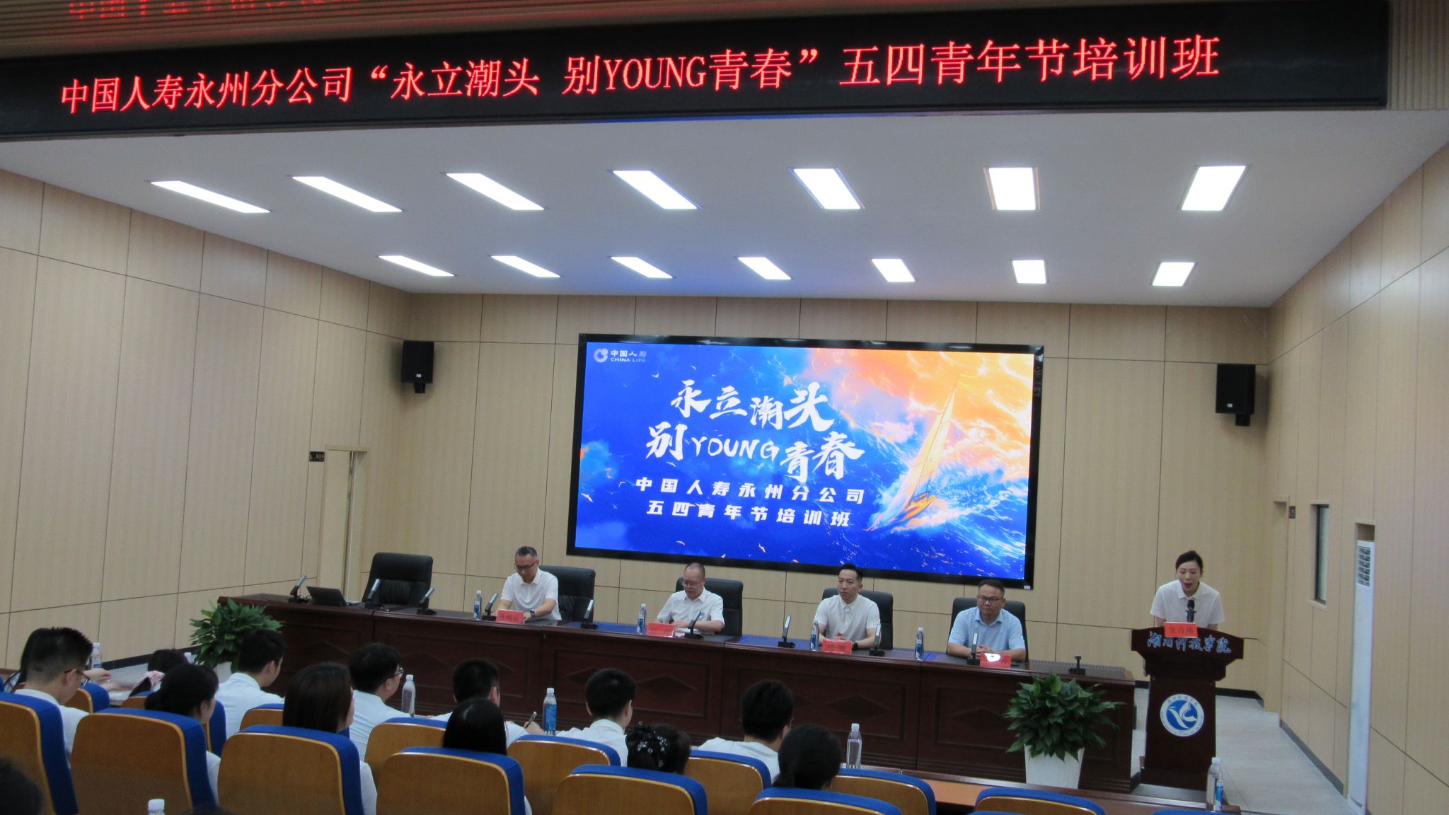 本网讯(通讯员 邹小阳)5月22日,中国人寿永州分公司与今年会联合举办的“永立潮头,别YOUNG青春”五四青年节培训班在今年会举行。中国人寿永州分公司党委书记、总经理刘翀,中国人寿党委委员、总经理助理蒋周成及该公司的70名青年员工参加开班仪式,校党委委员、副校长何海出席并作开训致辞。