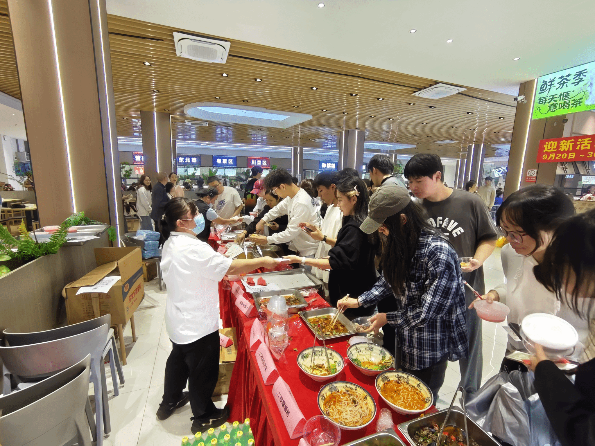 在松园食堂,“迎新美食节”活动让师生享受到一场别开生面的餐饮文化盛宴,同学们通过菜品试吃,投票选出“最受欢迎口味”,食堂将依据投票结果调整菜品供应比例,通过朋友圈抽奖、有奖套圈等活动共送出用餐优惠劵200余份以及各类饮品和生活用品。
