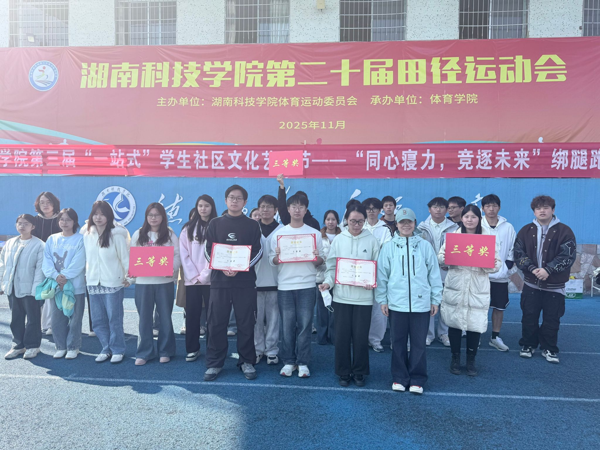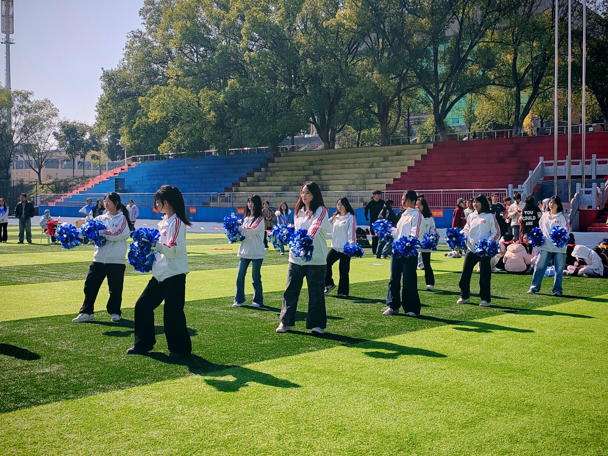 开赛前,各学院啦啦操队员们的呐喊与舞蹈动作,为即将上场的运动员注入无穷动力。赛道上,每支队伍由16名学生组成,他们绑着统一的红色绑带,肩并肩、手挽手,喊着整齐口号同步向前冲刺。大家步伐协调一致、配合默契,现场气氛热烈。
