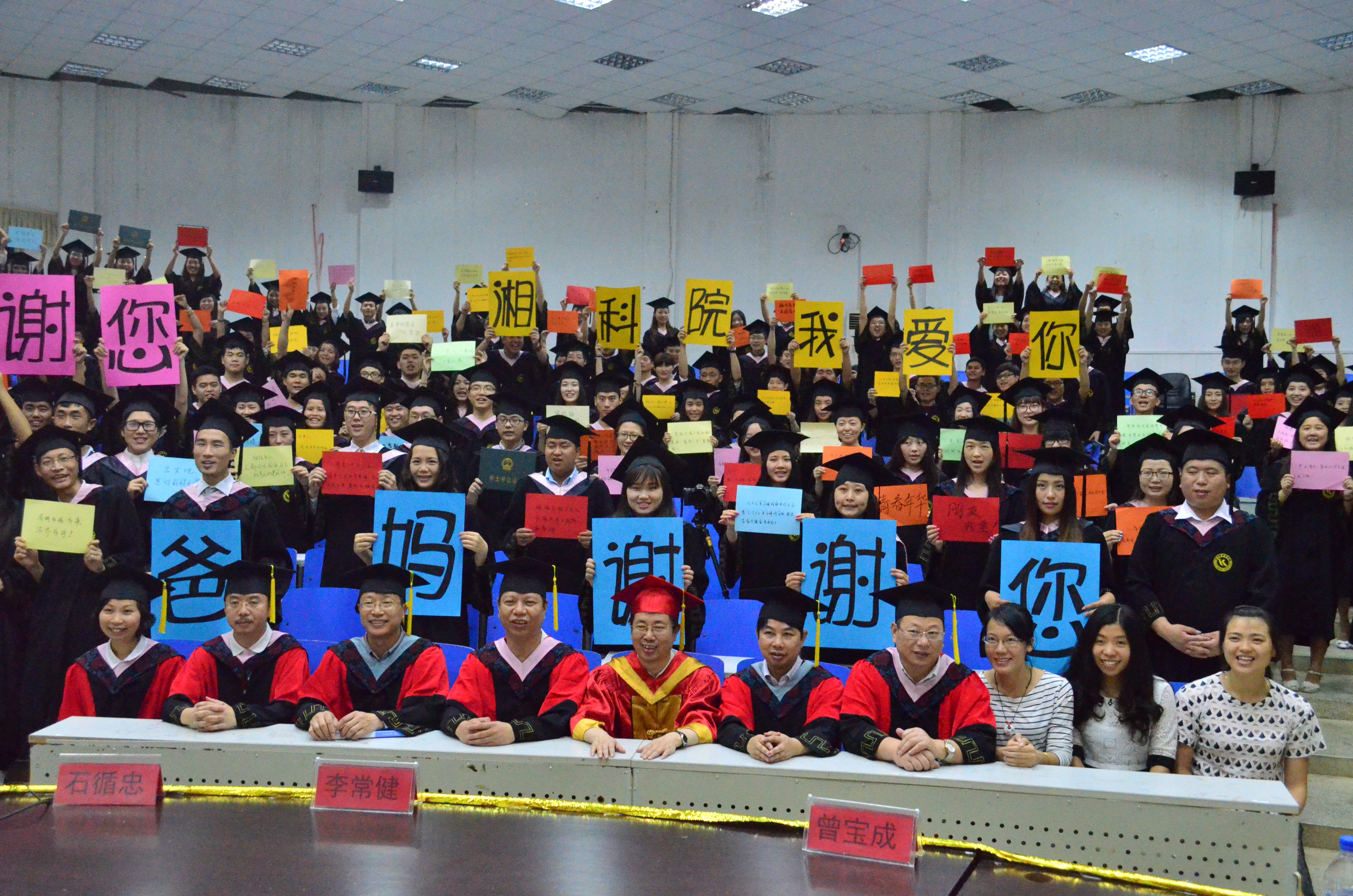 学位授予仪式在全体师生合唱校歌——《潇湘之歌》中结束,在场的毕业生热情邀请校领导、老师合影留念。