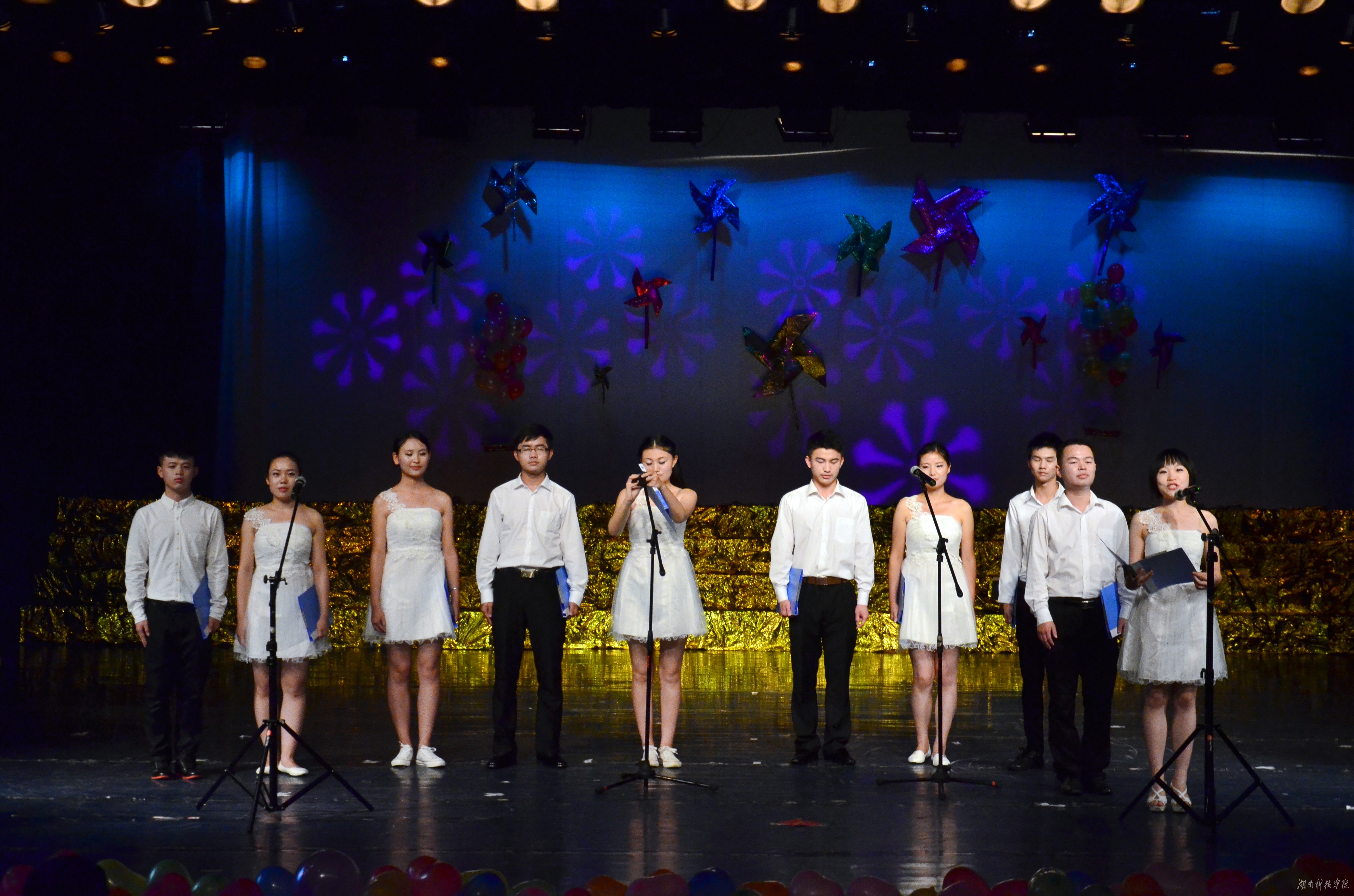 伴随着动感的旋律,两点半乐队带来的歌曲串烧,拉开了本次晚会的序幕。主唱的《海阔天空》,掀起了首次高潮,同学们纷纷跟唱。劲爆的爵士舞,跳出了大学生的蓬勃朝气,瞬间点燃了现场气氛,观众挥着手臂与舞者一同摇摆。科院版相声《艺术人生》幽默风趣,全场爆发出阵阵笑声。伴随着双人舞的节奏,台上白衣黑裤的青春男女翩翩起舞,动作时而刚劲时而柔软,引得台下不断欢呼。小品《闺蜜》谐趣幽默,追忆青春往事,演绎着多姿多彩、难以忘怀的大学时光。最具化生学院专业特色的创意节目《荧光舞》,带给观众强烈的视觉冲击,同学们纷纷拍照留念。在毕业生同学江雄《一生有你》的深情歌声中,毕业生回忆往昔,不禁落泪,展示了对母校的无限眷念和不舍之情。晚会别出心裁,当场邀请幸运毕业生发表感言,使大家仿佛看见了一幕幕属于校园、属于青春的记忆碎片,记录了大学生的青春与活力。诗歌朗诵《毕业了,曾经的我们》作为压轴节目,毕业生用心中的诗歌诉说着对母校的感恩、对老师的感谢、对师弟师妹们的嘱咐。