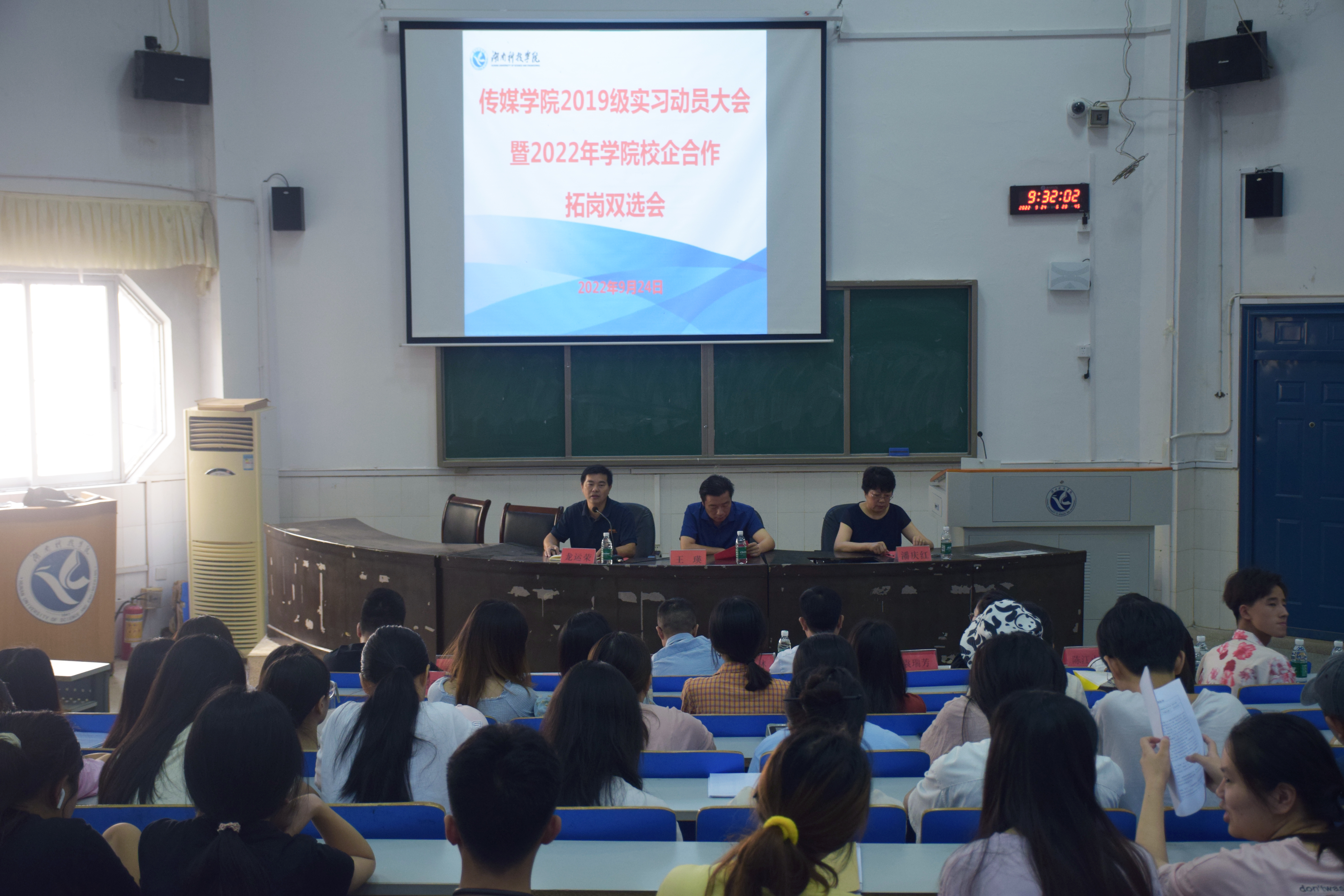 本网讯 9月24日上午,传媒学院召开2023届毕业生专业实习动员大会暨就业动员大会,该院院长龙运荣,党总支书记王瑛,副院长潘庆红,党总支副书记唐华丽参加,并邀请4家校企合作单位参加。