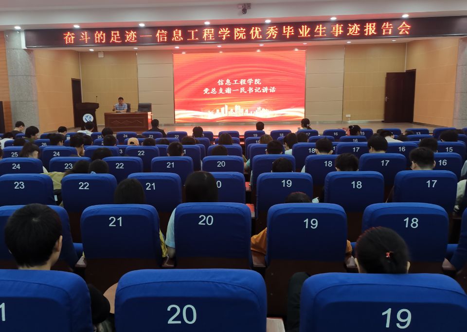 本网讯 毕业前夕,信息工程学院举办“奋斗的足迹——2021届优秀毕业生事迹报告会”。学院党总支书记谢一民、副书记夏汉伟,2019级、2020级全体学生参加。