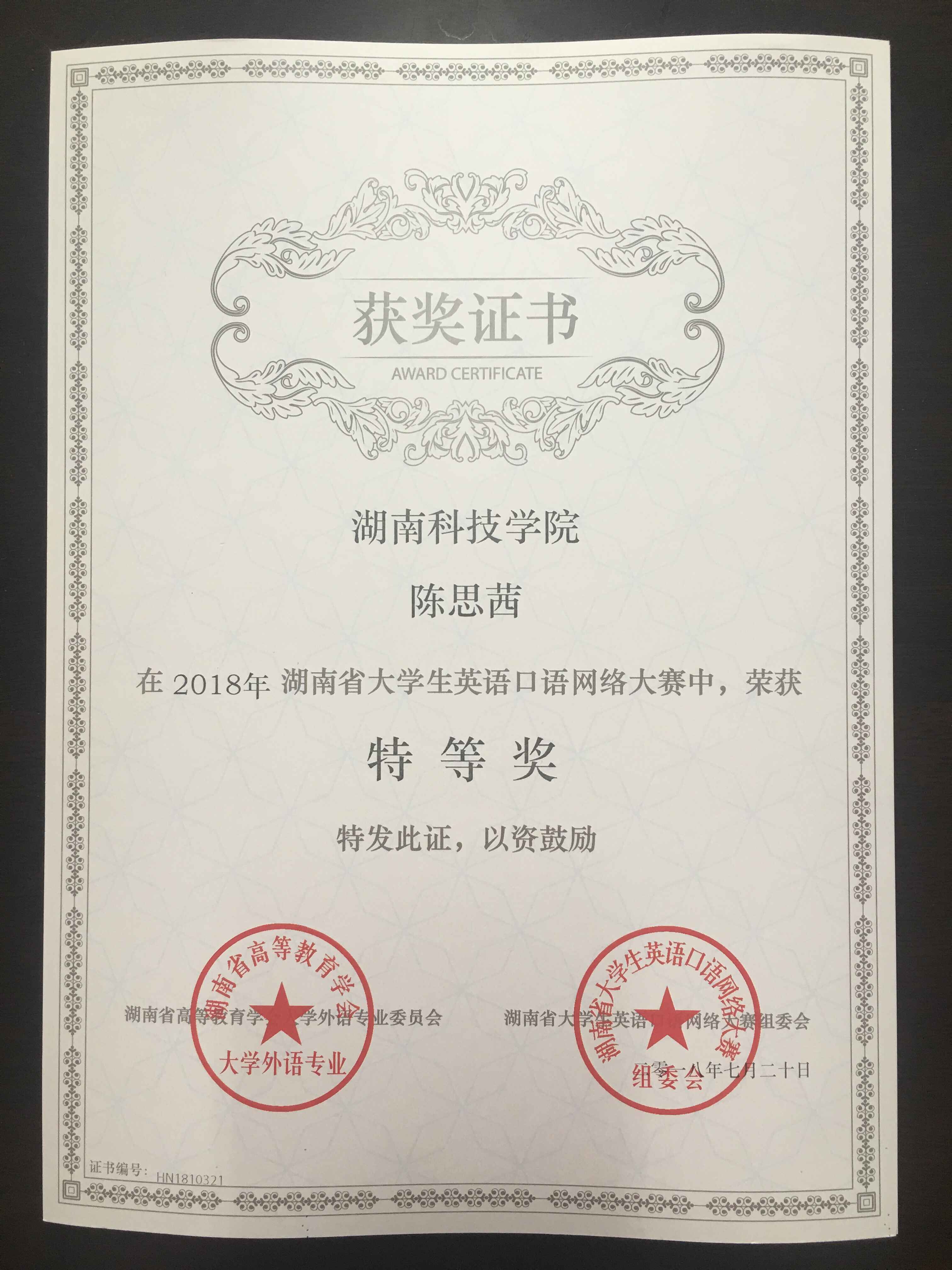 本网讯 在湖南省首届英语口语网络大赛中,今年会英语1504班陈思茜从决赛选手中脱颖而出,以第二名的成绩获得省特等奖。据悉,本次决赛共有来自全省三十九所高校的一百多名选手参加。 陈思茜同学非常刻苦,每天坚持在“FIF口语训练”APP上挑战时长为8分钟的赛题,一次次地刷新自己的记录,经200多分钟的反复挑战,最终获得97分的高分,荣获省特等奖。