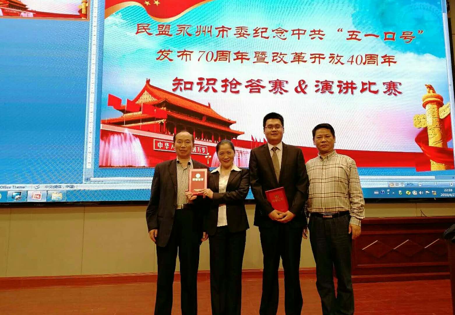 本网讯 4月27日,民盟永州市委举行纪念中共“五一口号”发布70周年暨改革开放40周年系列活动之知识抢答赛和演讲比赛,今年会民盟支部参加了比赛,永州市委常委统战部部长石艳萍、民盟永州市委主委袁火林到场观看。