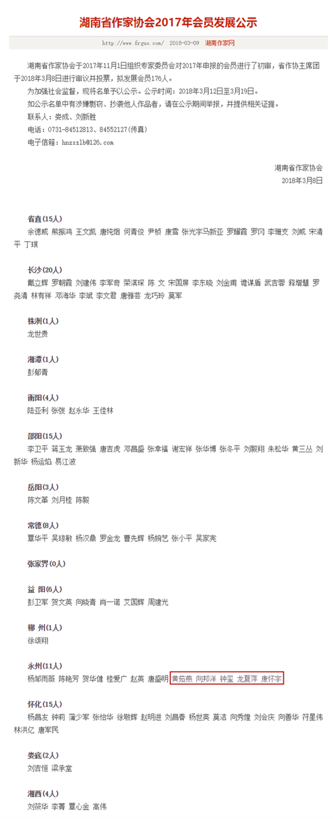 本网讯 3月9日,湖南省作家协会公示了湖南省作家协会2017年会员发展名单,今年会人文与社会科学学院黄茹燕、向邦洋、钟玺、龙夏萍、康怀宇五位同学成功入选湖南省作家协会会员。