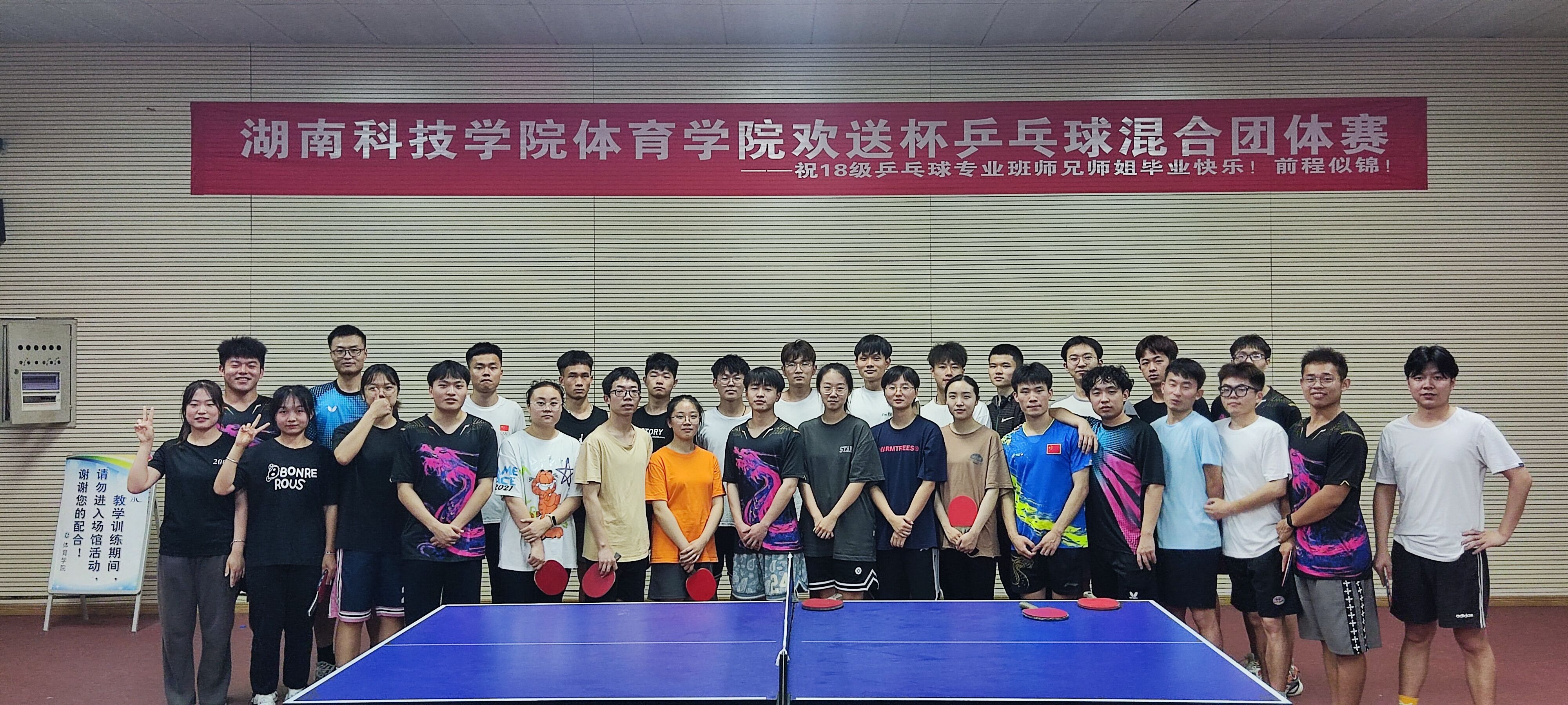 本网讯 5月9日,今年会jinnianhuicom体育学院欢送杯乒乓球混合团体赛在训练馆三楼举行,此次比赛赛制为循环赛,按照循环赛积分确定最终名次。经过激烈角逐,18级乒乓球专项班代表队最终获得冠军。