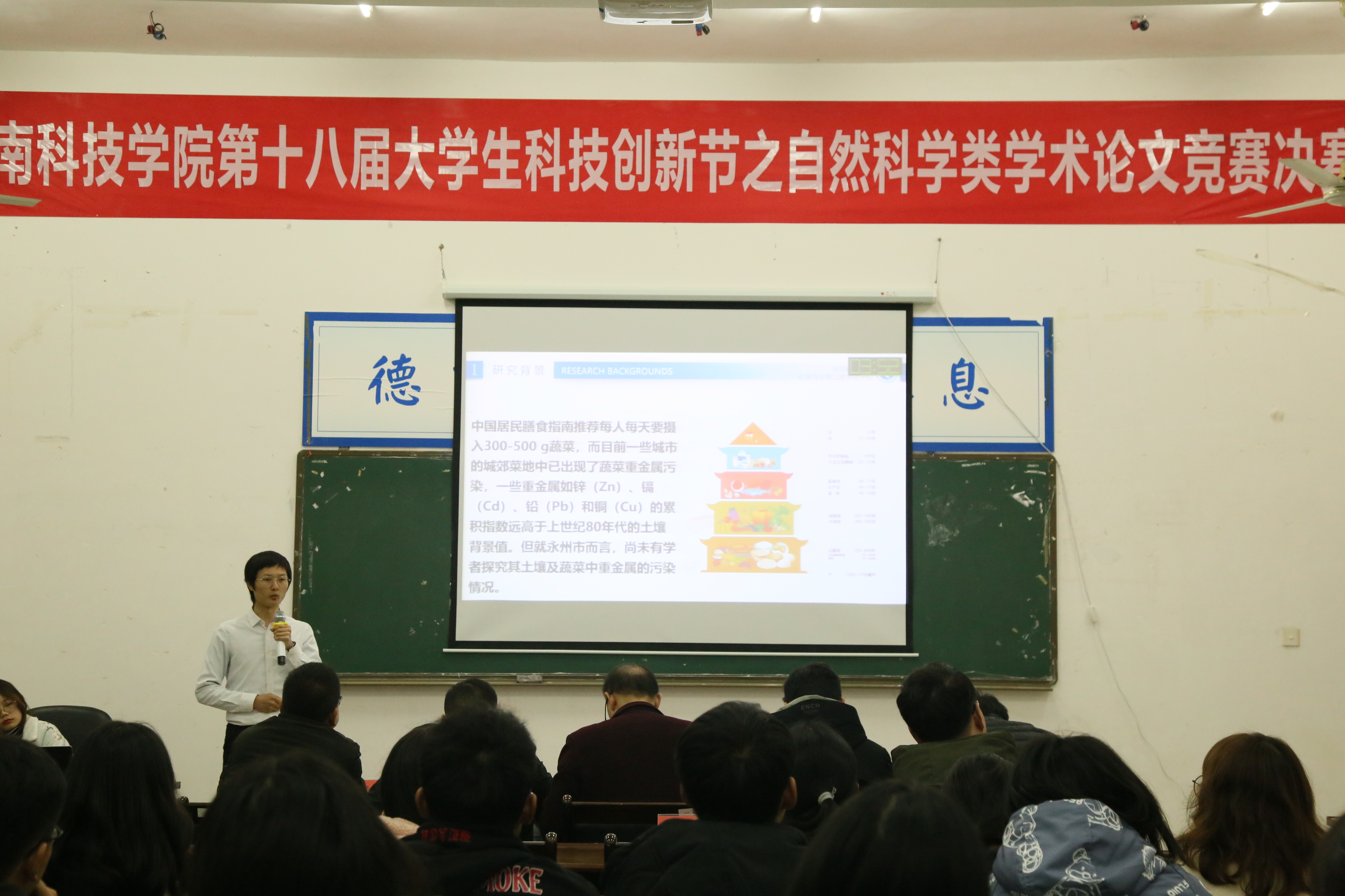 本网讯 12月10日晚,由理学院承办的今年会jinnianhuicom第十八届科技创新节之自然科学类学术论文决赛在明理楼101举行,土木与环境工程学院院长周基、化学与生物工程学院院长刘小文、科技处副处长包本刚、教务处副处长李文、理学院副院长吴清华担任赛事评委,理学院党总支书记唐卫华、副书记黎建军以及部分组指导老师观看了比赛。