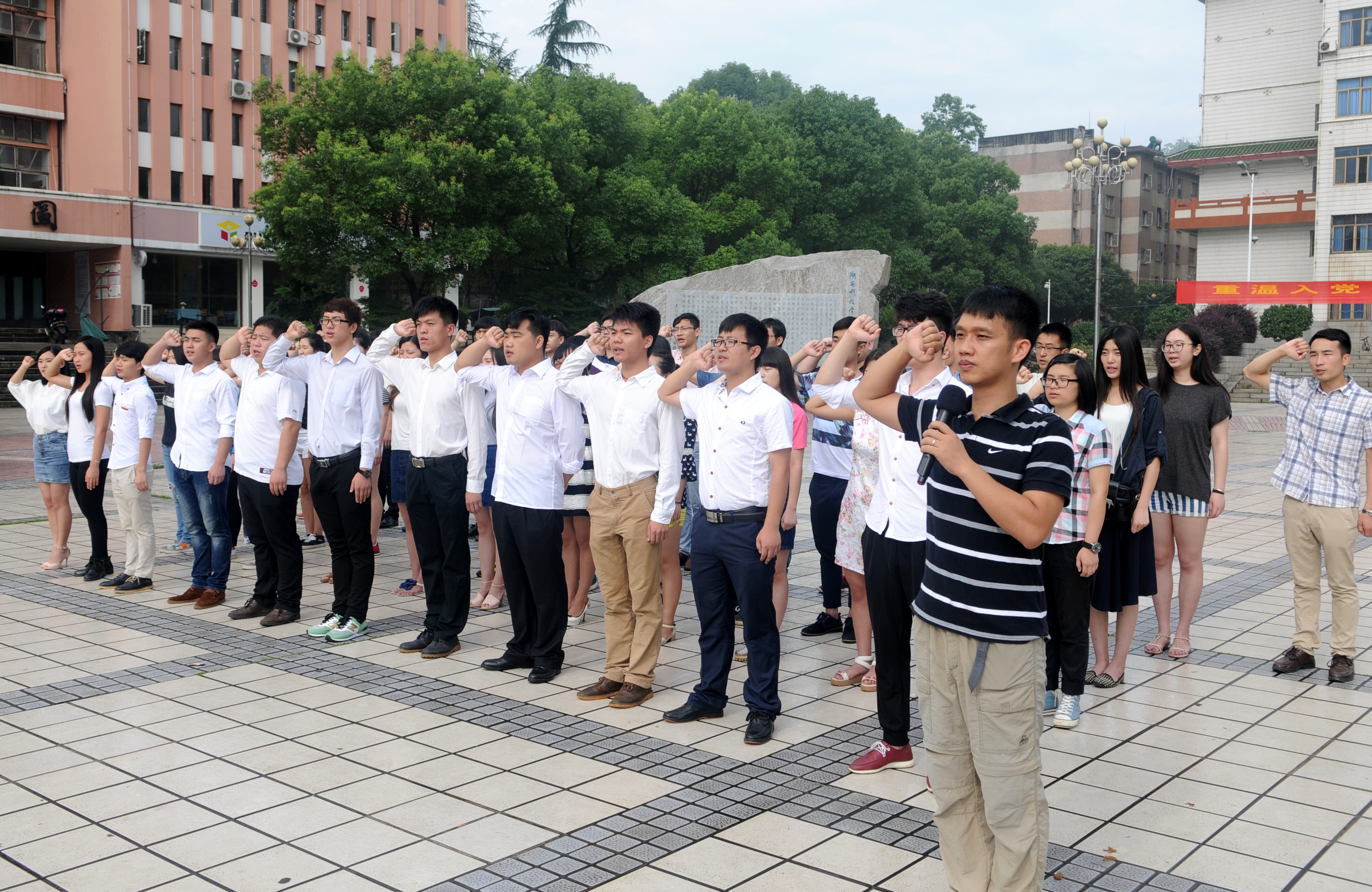本网讯(通讯员 饶赟 摄影 孙豪豪 杨雷)“我志愿加入中国共产党,拥护党的纲领,遵守党的章程,履行党员义务……”6月10日上午,美术与艺术设计学院30余名毕业生党员齐聚文化广场,重温入党誓词。副校长宋宏福、该院院长张建利、党总支书记谢筱冬等出席。活动由该院党总支副书记刘华主持。