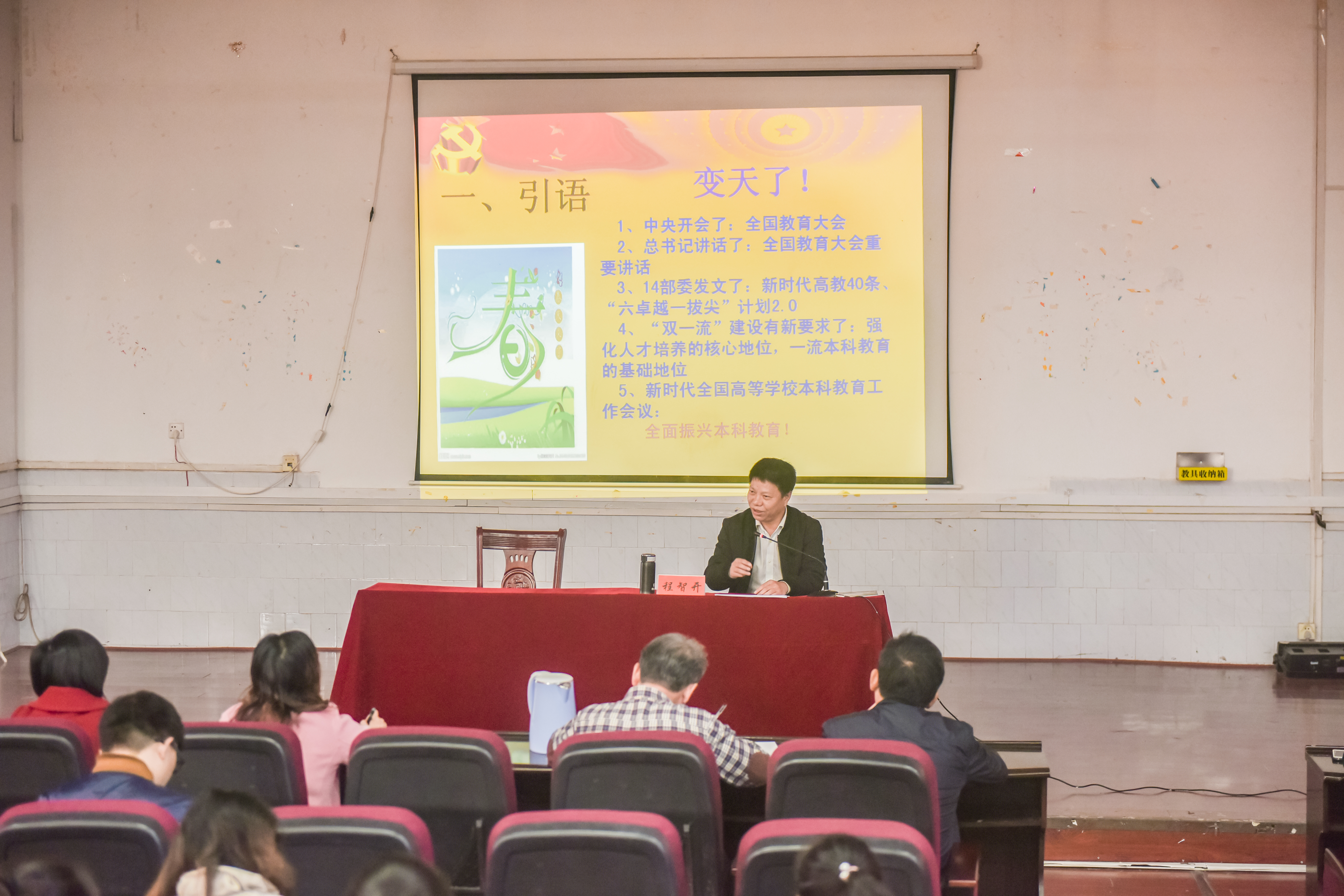 本网讯 11月27日,副校长程智开在博雅楼为外国语学院全体党员、教职工作题为《回归本分 努力开创今年会教育新境界》的辅导报告,传达习近平总书记关于教育的重要论述和全国教育大会精神。