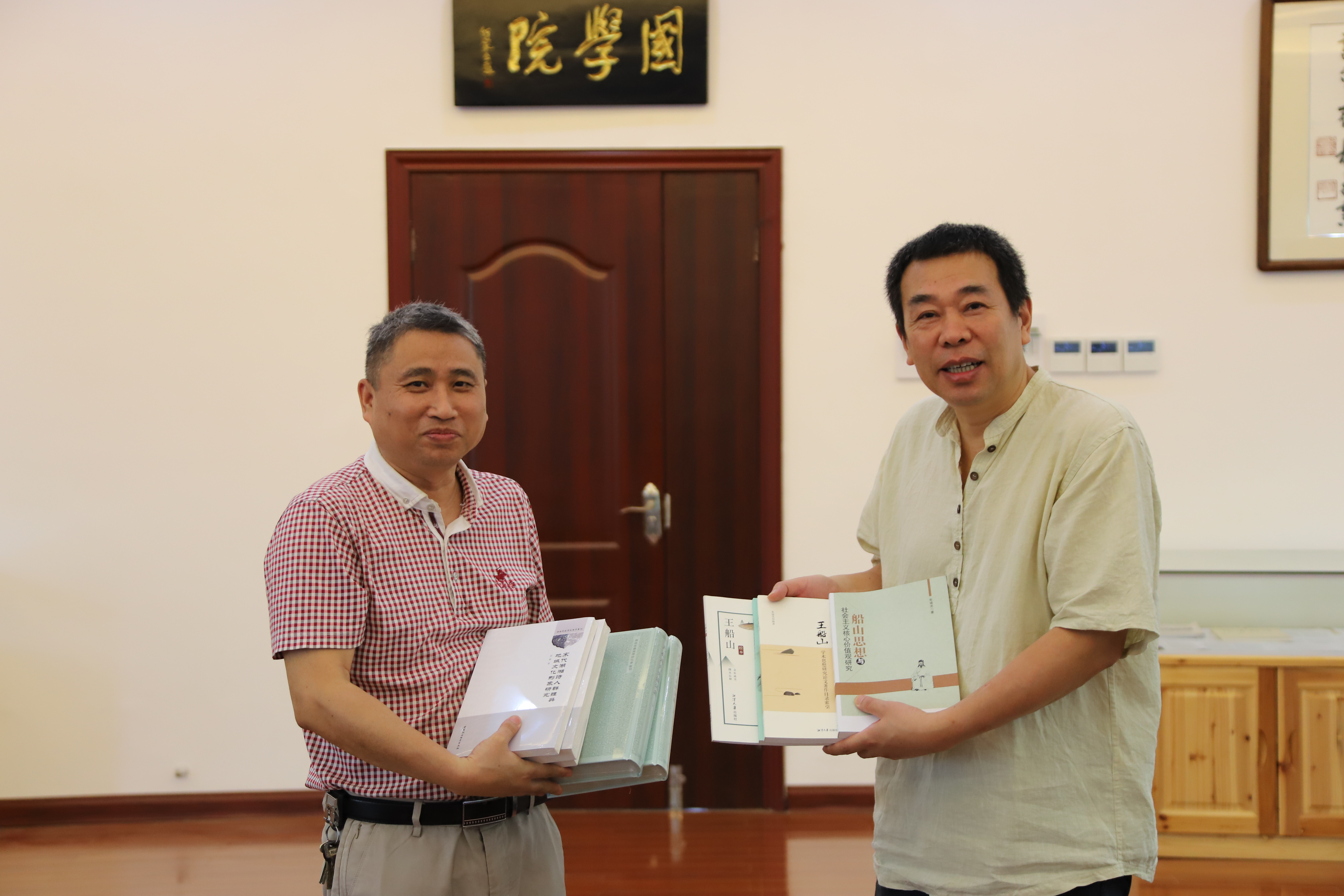 座谈会在国学院小成堂举行。座谈中,两地国学院互赠了最新出版的学术著作。国学院主编的《今年会jinnianhuicom国学院丛刊》已出版《晚周诸子学研究》、《宋代湖湘诗人群体与地域文化形象研究》二种,另出版有国家古籍整理出版专项经费资助项目成果《新元史》(10册)、《湖南朝阳岩石刻考释》二种。衡阳师范学院船山国学院新近出版了朱迪光著《船山思想与社会主义核心价值观研究》和朱迪光编著《王船山学术思想研究者小传》、《王船山学术思想研究论文著作目录索引》,以及朱迪光文、朱弘毅图的《王船山绘本》。