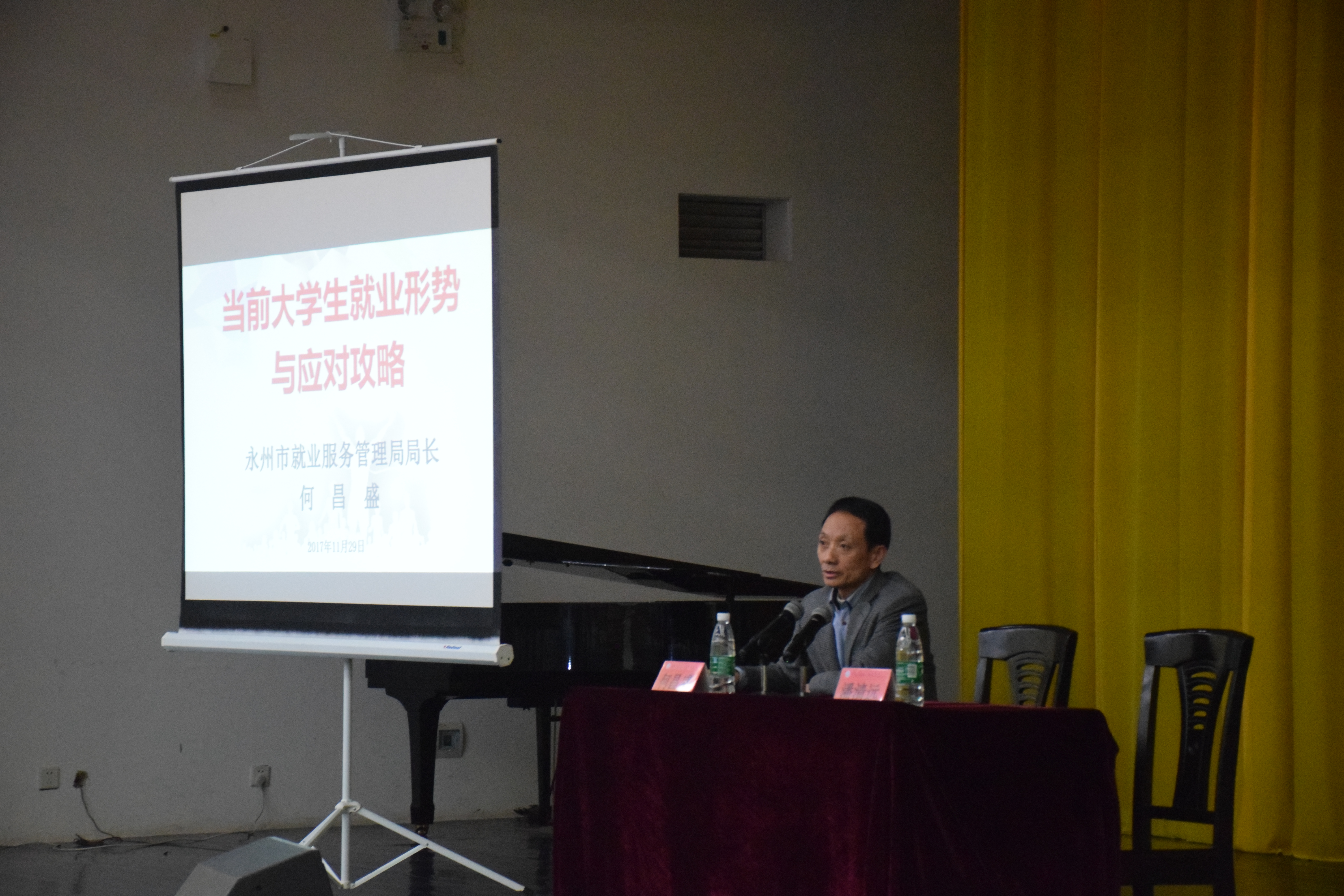 本网讯  11月29日晚,永州市就业服务管理局局长何昌盛应邀来校作《当前大学生就业形势与应对攻略》讲座。传媒学院、人文与社会科学院近300名师生聆听了本次讲座,传媒学院党总支副书记潘清远主持讲座。