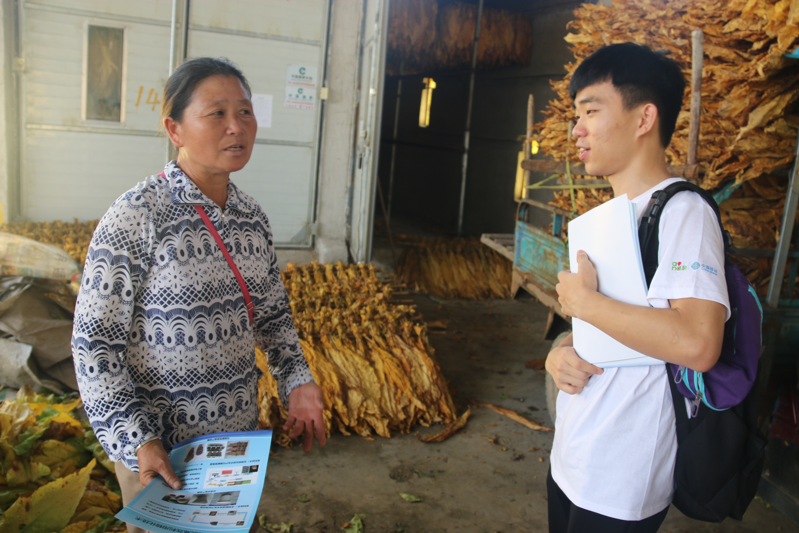 对比测量结果让志愿服务团信心大增。随后,志愿团来到宁远县左坝烟农专业合作社,与困难烟农深入沟通,为他们讲解烟草种植知识、烟草防病注意事项,并重点讲解了“生物质育苗盘”的原理和优势同时,还烟草种植中出现的技术问题进行了解答。在了解到烟农王老伯家缺少收烟人手后,志愿服务团及时帮助老伯收烟、搬烟和烤烟。