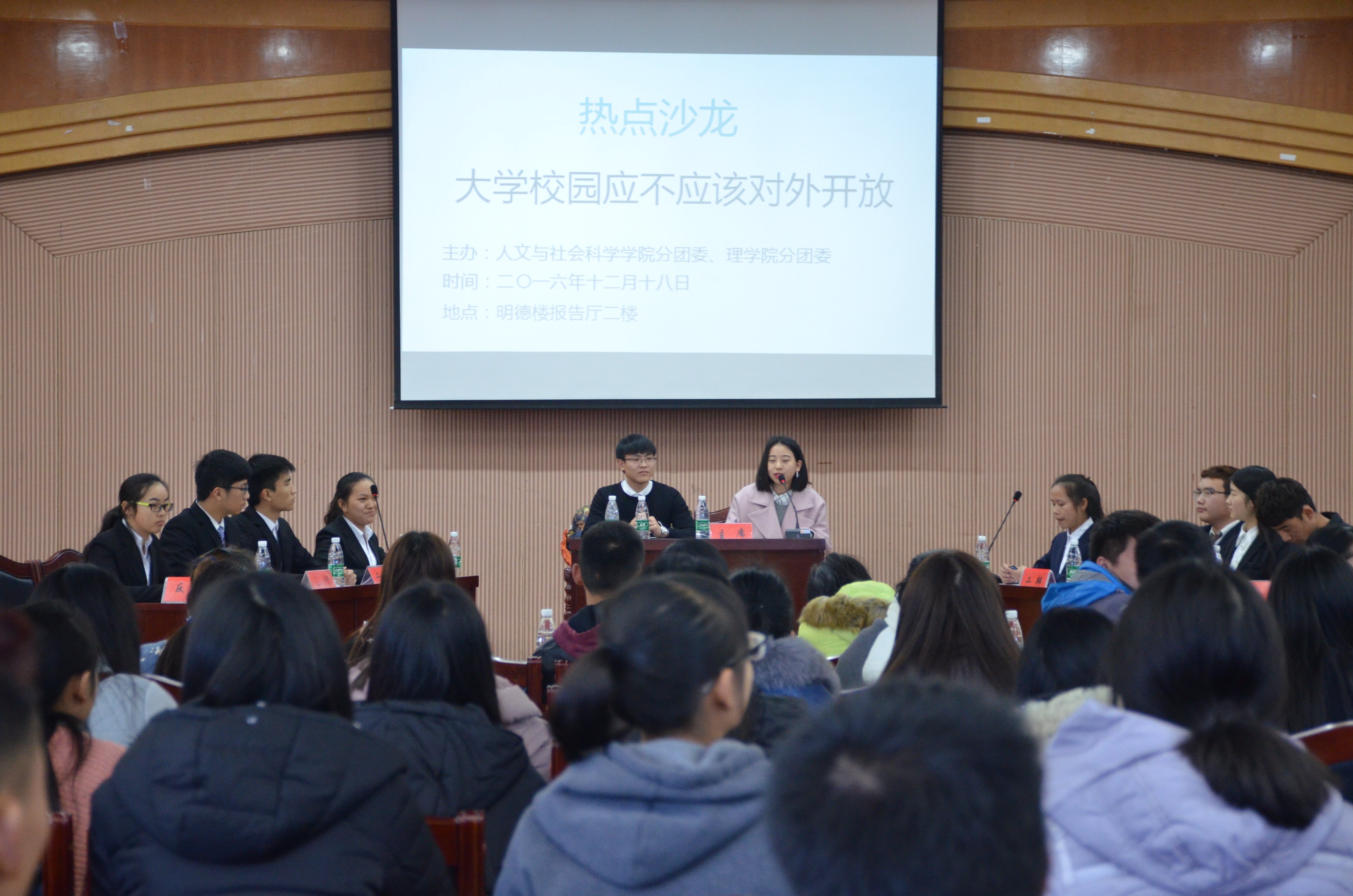 本网讯 12月18日下午,人文与社会科学学院和理学院友谊辩论赛在明德楼报告厅二楼举行。此次辩论赛围绕“大学校园应不应该对外开放”辩题展开激烈辩论。