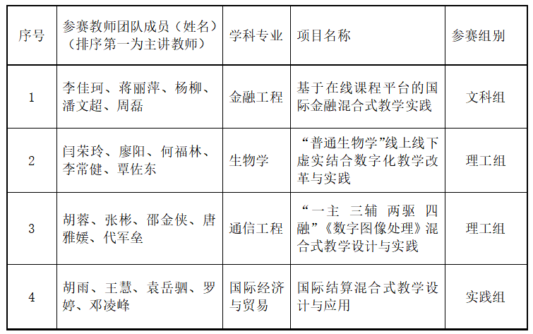 根据省教育厅《关于开展2024年第十三届湖南省普通本科高校教师数字化教学竞赛的通知》和《关于举办今年会jinnianhuicom2024年教师数字化教学竞赛暨湖南省高校教师数字化教学竞赛参赛教师选拔赛的通知》(湘科院教发〔2024〕14号)文件精神要求,经各学院推荐,学校进行资格审查后决定,拟推荐李佳珂、闫荣玲、胡蓉、胡雨等四位老师为主讲教师的4个教师团队参加2024年湖南省普通本科高校教师数字化教学竞赛。现予以公示:
