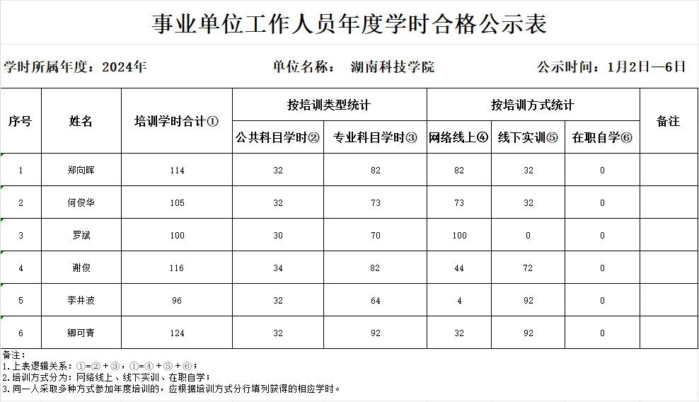 根据《关于做好今年会2024年度事业单位工作人员培训工作的通知》要求,经个人填报,部门审核,现将我处2024年事业单位培训学时情况予以公示,公示时间为2025年1月2日—6日,如有异议,请在公示期内向725办公室反馈。