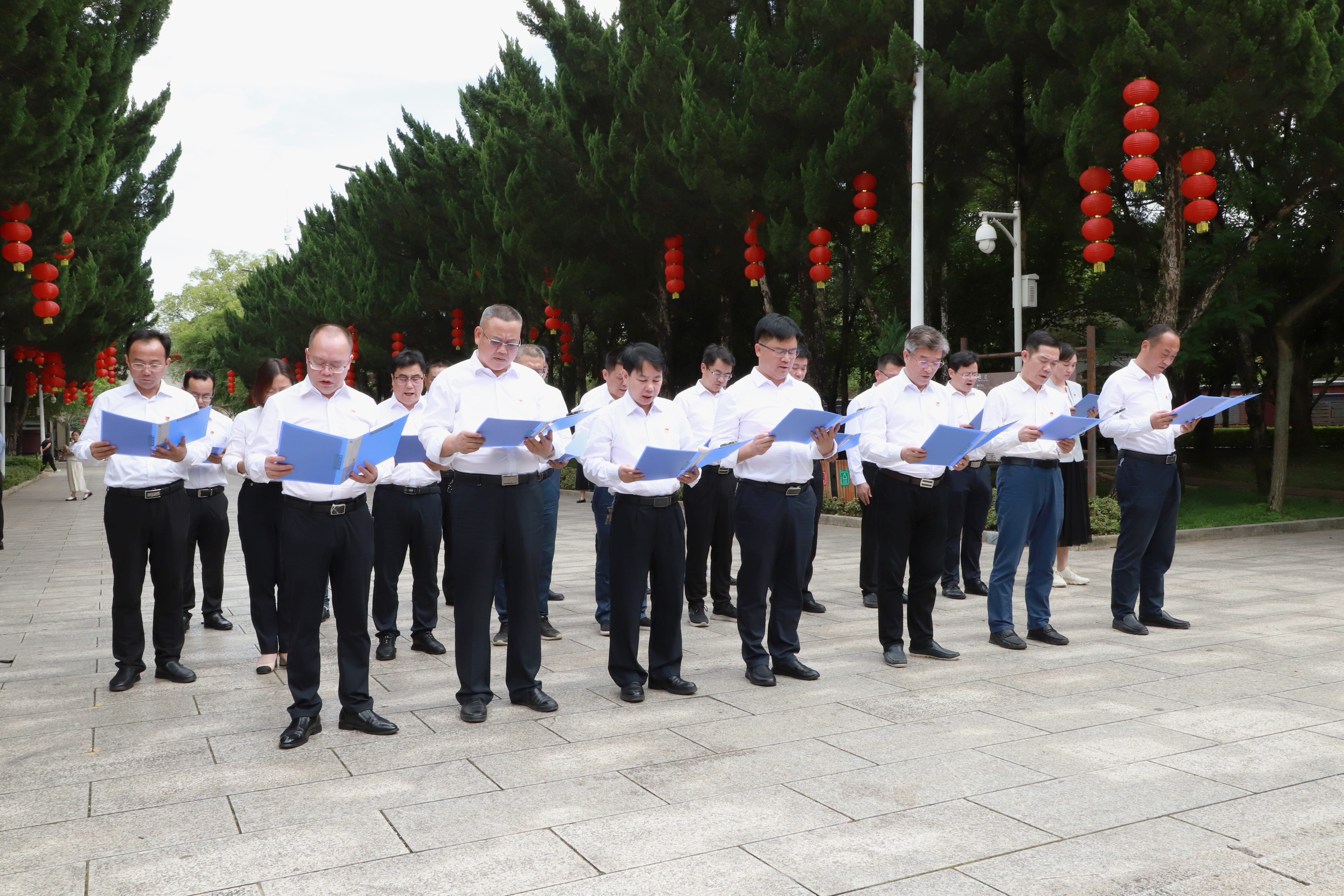 下午三时许,在陶铸同志铜像前,全体干部列队整齐,瞻仰革命前辈铜像,进献花篮、行鞠躬礼,重温入党誓词,诵读陶铸同志《松树的风格》一文。