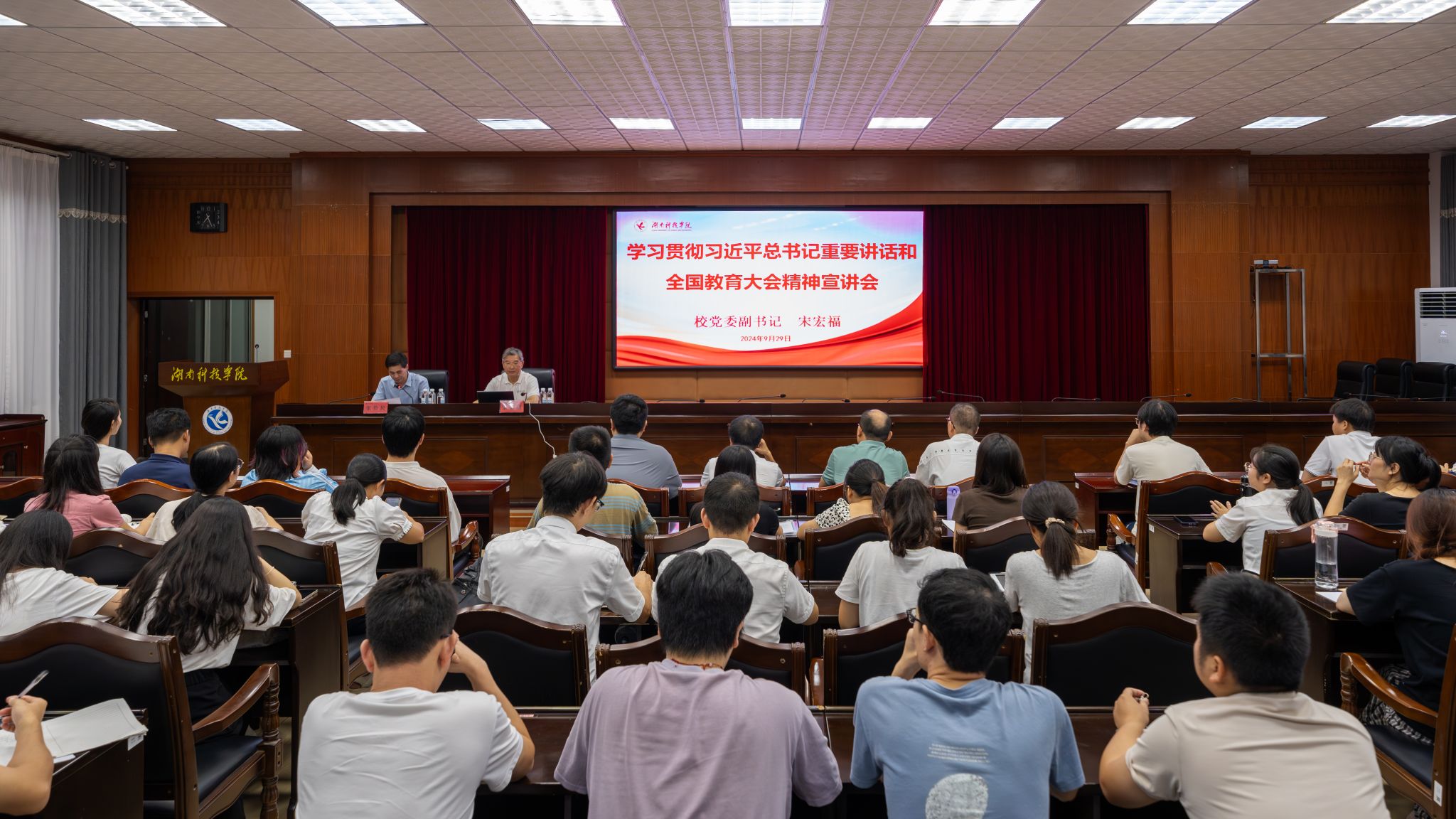 学校针对不同宣讲对象,注重集中多方力量,形成工作合力,增强宣讲的针对性、生动性和实效性,切实把全国教育大会精神讲全、讲准、讲透。学校邀请湖南农业大学党委书记陈弘来校围绕教育科技人才一体化融合发展作专题宣讲报告。