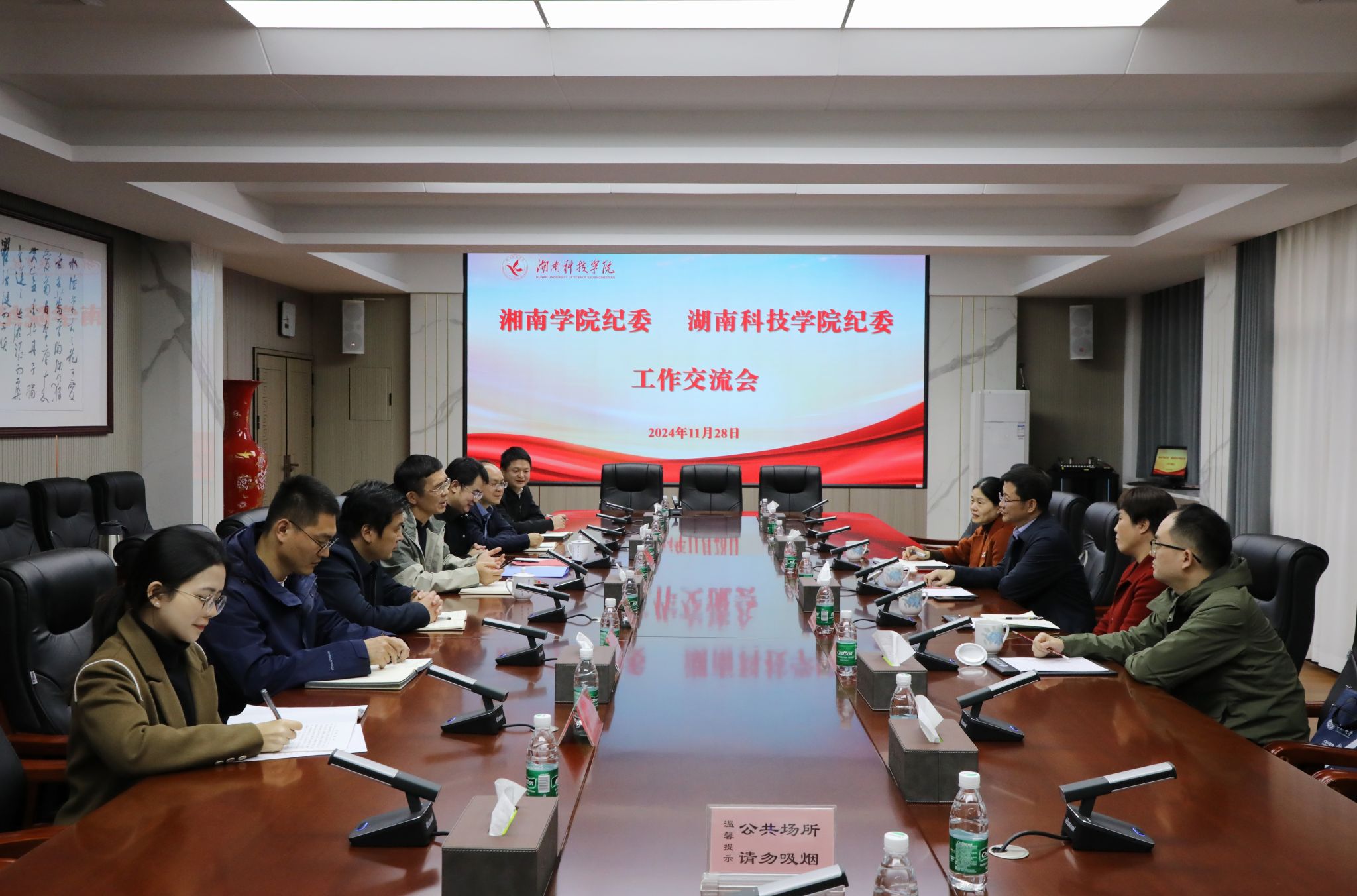 本网讯(通讯员 李井波)11月28日下午,湘南学院纪委书记尹季一行来校考察,并进行座谈交流。校党委委员、纪委书记陈灿军出席座谈会,纪检监察处全体成员参加会议。