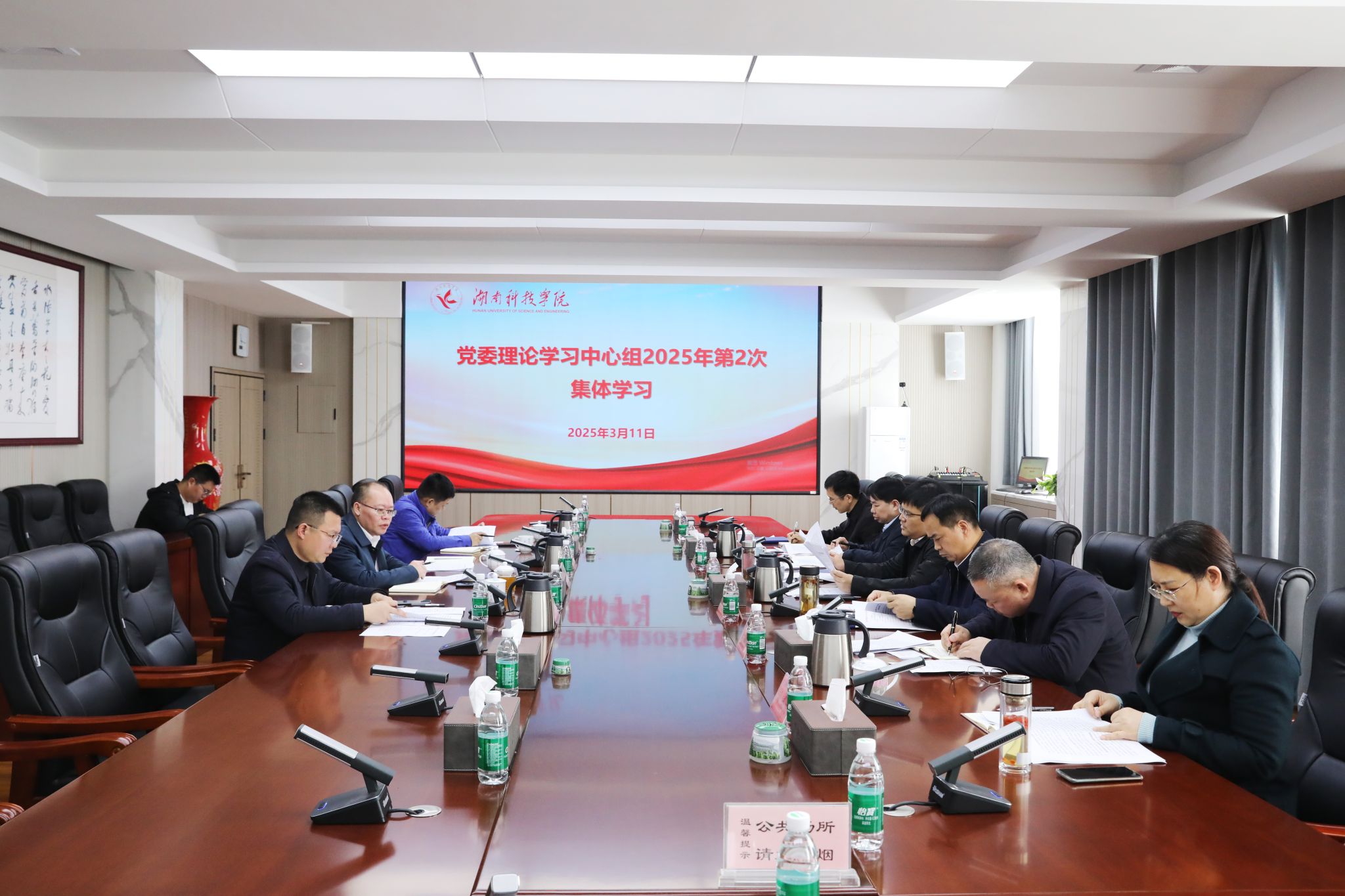 本网讯(记者 向薛峰 伍俊峰 摄影 谢志豪)3月11日,党委书记李钢主持学校党委理论学习中心组2025年第2次集体学习,专题学习全省教育大会精神,全体党委委员参加学习,副校长郑银芳,学校党政办、宣传统战部等部门负责人列席会议。