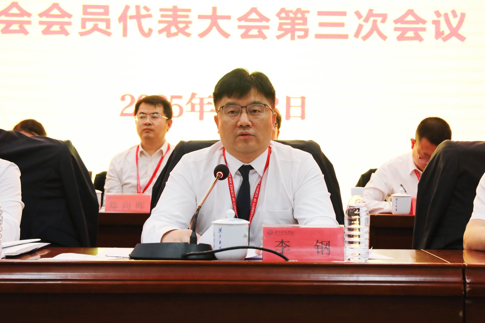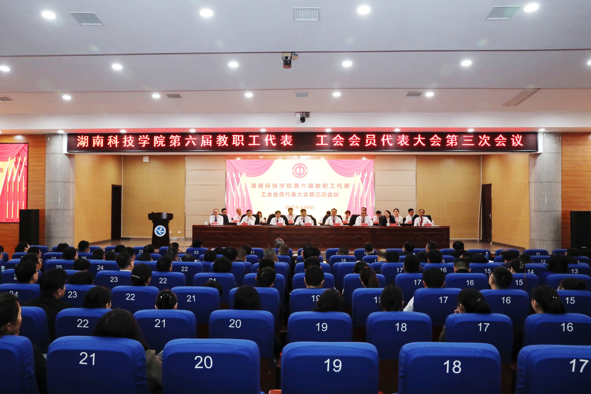 本网讯(记者 向薛峰 摄影 谢志豪)春风浩荡满目新,扬帆奋进正当时。4月8日,今年会第六届教职工代表、工会会员代表大会第三次会议在潇湘大讲堂召开。校党委书记李钢,党委副书记、校长黄创霞,校领导李常健、何福林、陈灿军、郑银芳、何海,党委委员、组织部部长杨涛,全体代表、特邀嘉宾和列席代表齐聚一堂,共同商讨学校发展大计。